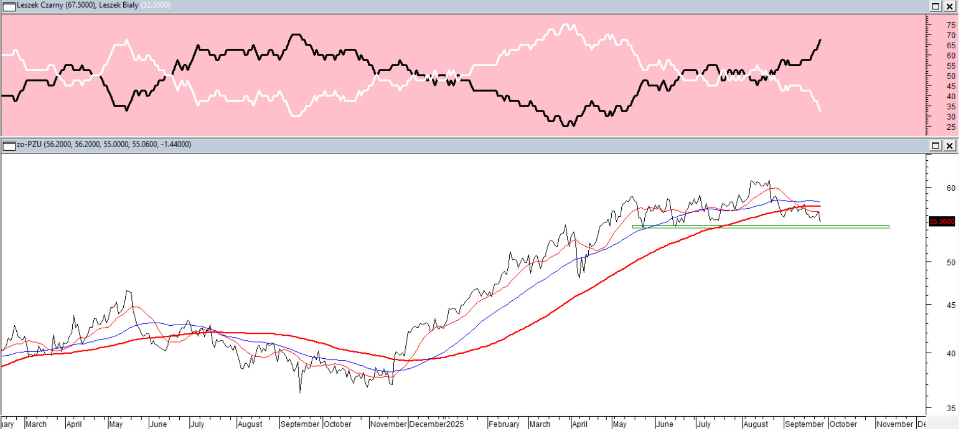 Od maja kurs największego naszego ubezpieczyciela pozostaje w ruchu bocznym. Ważne wsparcie to majowe oraz czerwcowe minima, strefa 54,00-54,50 zł. Jeżeli o sile trendu w średnioterminowej perspektywie (np. 2 miesiące) ma decydować ilość białych i czarnych korpusów to z pewnością taką siłę posiadają raczej niedźwiedzie. Liczba czarnych (podażowych) korpusów zbliża się powoli do 70%. Słabemu sentymentowi wtórują tu podażowo ułożone średnie 15/45/100.