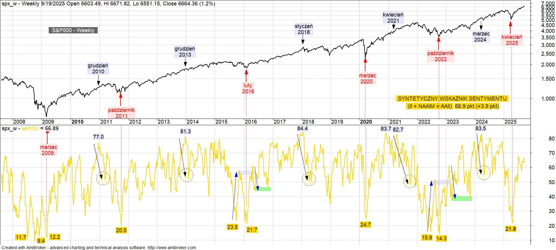 Syntetyczny wskaźnik sentymentu uśredniający znormalizowane do przedziału 0-100 pkt cotygodniowe wskazania Investors Intelligence (biuletyny inwestycyjne), NAAIM (aktywni zarządzający) oraz AAII (inwestorzy indywidualni) od początku lipca stabilizuje się po wcześniejszym dwumiesięcznym mocnym odbiciu z jednej z najniższych w ostatnim dziesięcioleciu wartości 21.8 pkt. Co szczególnie warte podkreślenia, ten odnotowany w kwietniu odczyt lokuje się już w zakresie 14.3 – 24.7 pkt, gdzie w ostatnich czterech cyklach formowały się kontrariańskie dna sentymentu. Interpretacja skrajnie niskich odczytów sentymentu (w przeciwieństwie do odczytów skrajnie wysokich) jest dość jednoznaczna – pojawiają się one praktycznie jednocześnie z dnami bessy na rynku akcji. Należałoby przy tym dokonać rozróżnienia na schemat ‘pojedynczego dna’ (jak w październiku 2011 i marcu 2020) oraz ‘podwójnego dna’ (październik 2015 / luty 2016 i czerwiec/październik 2022). Zasadniczo jeszcze do końca pierwszego półrocza trudno było ocenić, który z tych wariantów ma większe szanse pojawić się obecnie, jednak dwie wysokie tygodniowe białe świece S&P500 z przełomu czerwca i lipca już bardziej zdecydowanie opowiedziały się za ścieżką ‘pojedynczego dna’. Podobnie można interpretować fakt, iż wskaźnik syntetyczny niejednokrotnie zdołał już przekraczać pułap 60 pkt, który podczas alternatywnej ścieżki ‘podwójnego dna’ nigdy nie był osiągany.