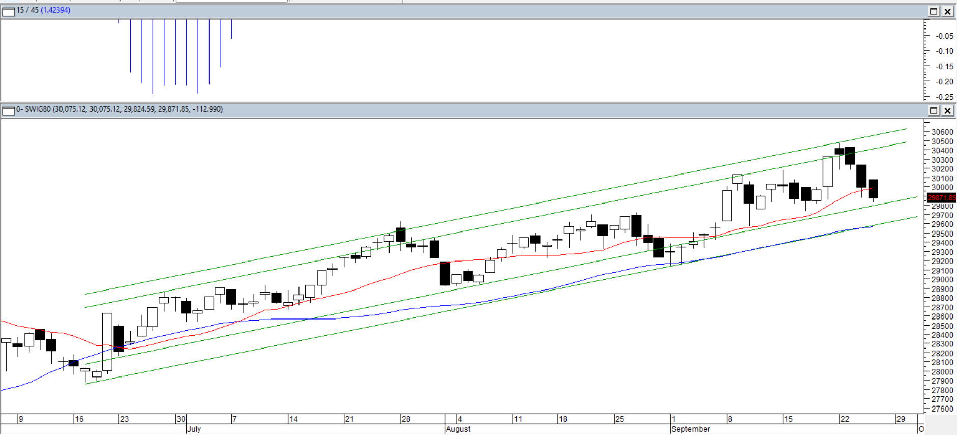 Indeks małych spółek pozostaje spośród czterech najważniejszych indeksów notowanych na GPW wciąż najsilniejszym. O jego sile może świadczyć fakt, że średnia krótkoterminowa z 15 sesji przebywała pod średnią z 45 sesji w tym roku raptem kilkanaście sesji i nie głębiej niż 0,5%. Jednak słaby sentyment ostatnich sesji dopadł i ten segment. Na wykresie pojawiła się spadkowa formacja „Trzech Czarnych Kruków”. Mimo to kurs nadal porusza się wewnątrz formowanego od czerwca kanału wzrostowego, co może koić nerwy co bardziej nerwowych byków.
