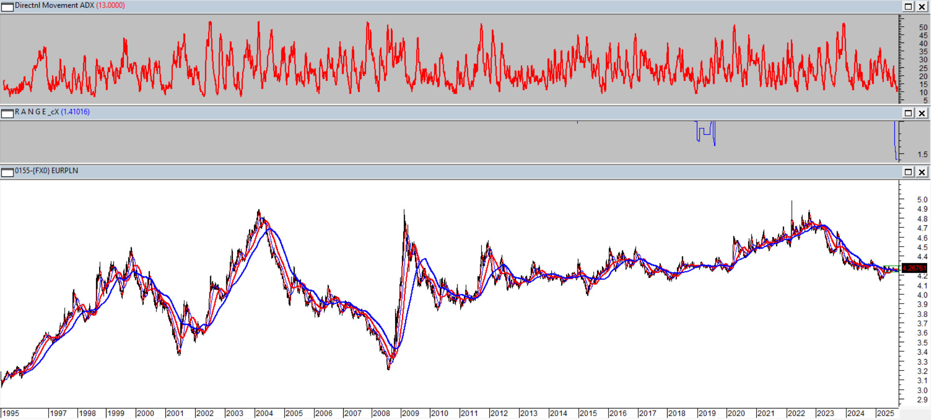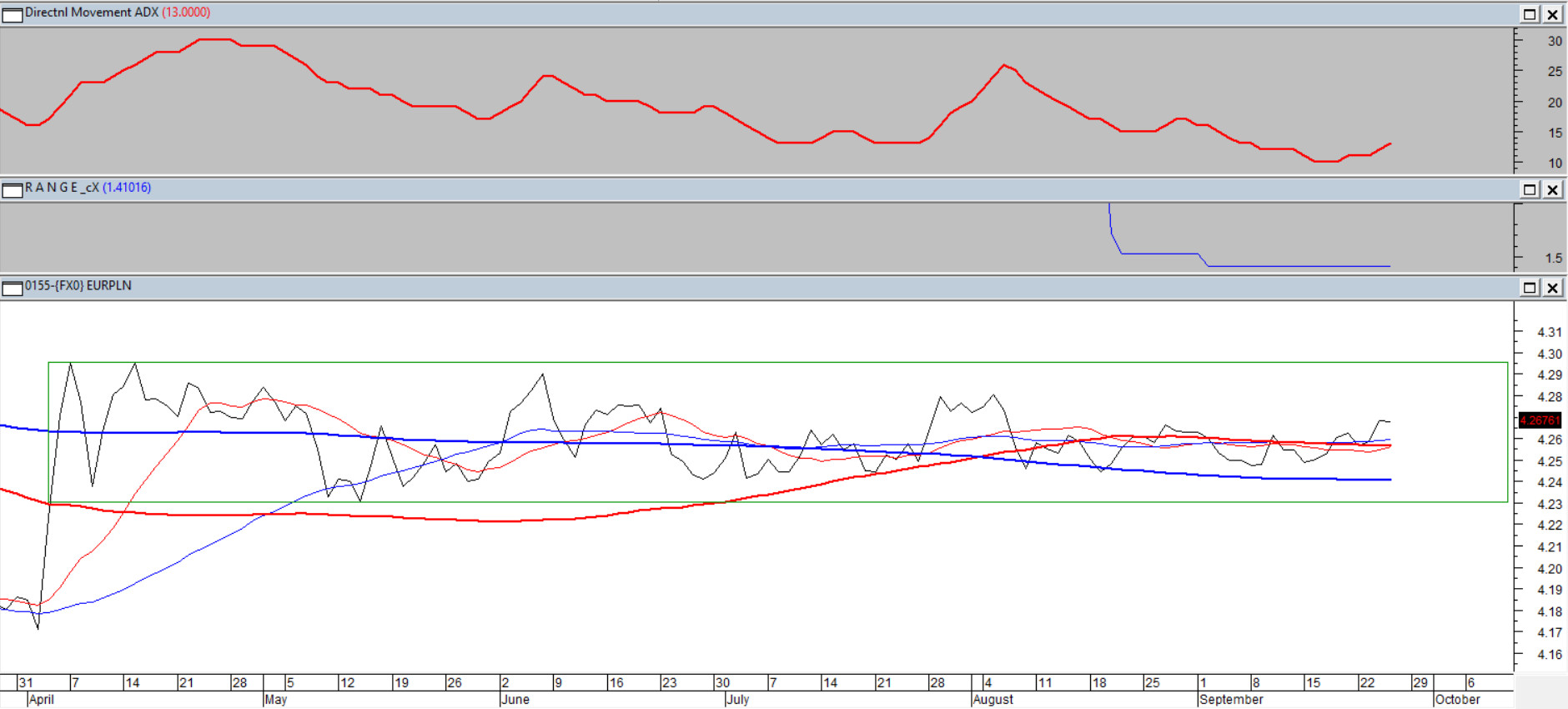Od kwietnia kurs EURPLN zatracił swoją naturalną zmienność i porusza się w irytującym trendzie bocznym z ekstremami z tego okresu 4,23-4,29 zł. Taki stan trwający na dobre już od 5-ciu miesięcy jest nie tylko rzadko spotykany, ale jedyny w swoim rodzaju. Rozrzut (liczony przeciętnie ze 100 sesji) spadł bowiem poniżej 1,5%, co stawia ten czas na pierwszym miejscu w kategorii "najbardziej wąski range" w tej perspektywie czasowej w ciągu ostatniego 30-lecia !!! Zazwyczaj tak długo trwająca męcząca stabilizacja poprzedza koniec konsolidacyjnych męczarni z sugestią przygotowania do wejścia w trend bardziej wertykalny. Jednak póki co kurs nie wykazuje żadnych istotnych oznak sugerujących zmianę, poza oczywiście samą jego gotowością.