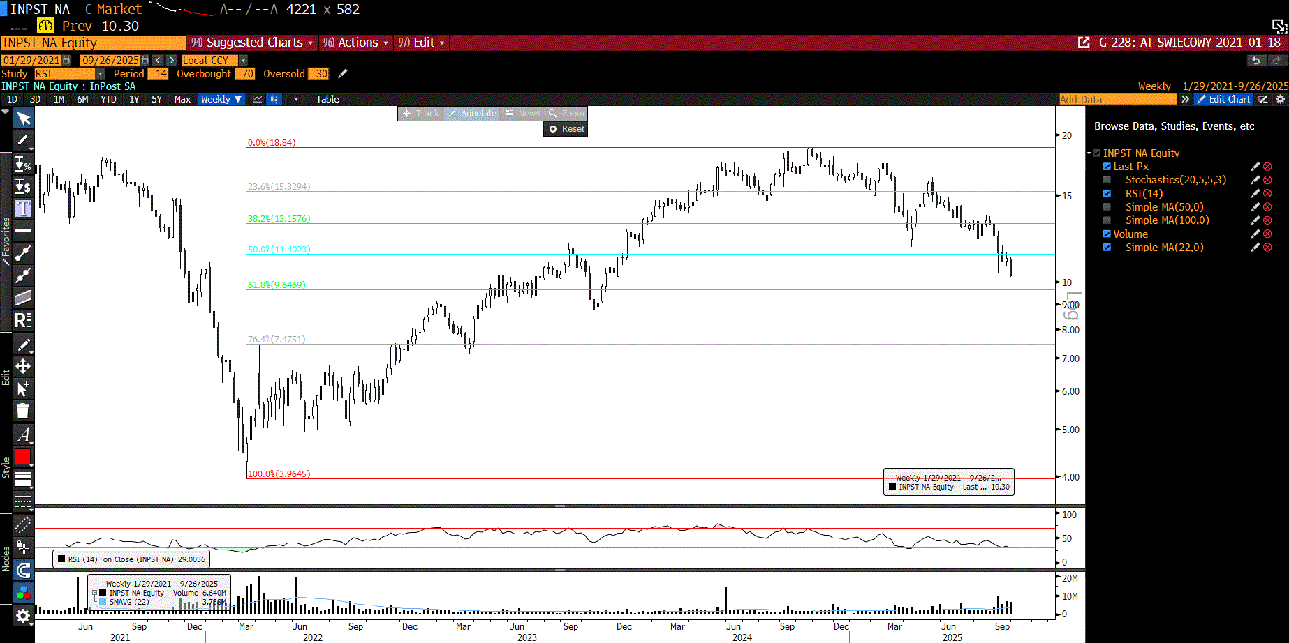 Informacja pokazuje zaostrzającą się konkurencję dla InPostu, co wraz ze zbliżającym się końcem umowy za Allegro (2027 r.) implikuje możliwość ponad 50% korekty wzrostów od 2022 r.