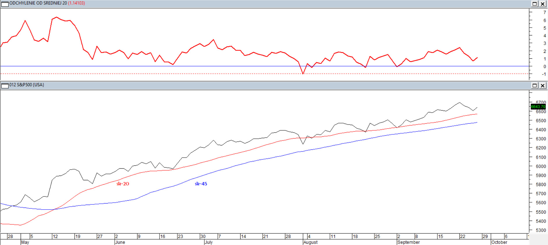 Od kwietniowych minimów kurs najważniejszego indeksu na świecie porusza się w typowym trendzie wzrostowym. Obecnych ruch przyjął od początku maja strukturę impulsowej trójki. Interesujące jest to, że obecny trend jest tak silny, że prosta średnia z 20 sesji (miesiąc) została tylko raz naruszona na głębokość 1% (1 sierpnia). Pozostałe "korekty" nie przekraczały tej średniej albo miały swój kres tuż przy średniej. W tej sytuacji może ona również spełniać rolę klasycznego trailing-stopa dla trwającego trendu.