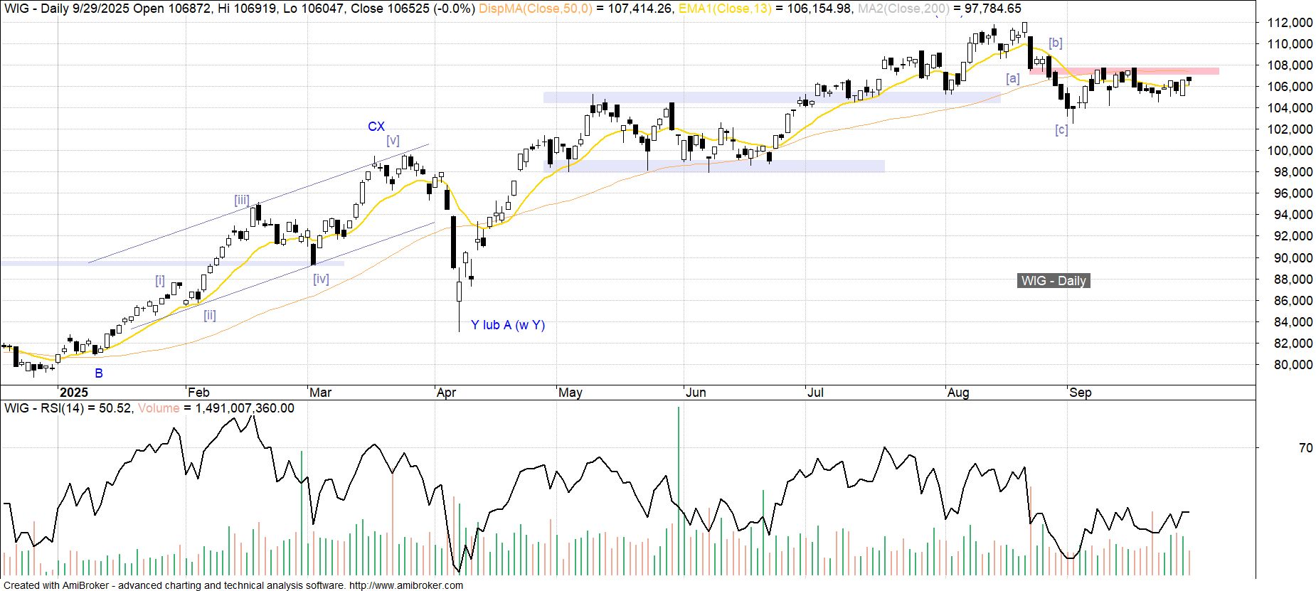 W ramach wrześniowego odreagowania w górę WIG dwukrotnie tymczasowo znalazł się ponad przełamanym wcześniej lokalnym minimum 107.3 tys. pkt z 22 sierpnia, które do tej pory dość jednoznacznie kojarzyło się z dnem fali [i] w domniemanym 5- falowym impulsie spadkowym zapoczątkowanym w tegorocznym szczycie 112.0 tys. pkt. Takie naruszenie pozwala powrócić do alternatywnego wariantu zakończonego już spadkowego zygzaka [a][b][c] (w miejsce początkowych fal [i][ii][iii] w impulsie), choć wobec braku symptomów odwrócenia obrazu relatywnej słabości należałoby go traktować raczej jako pierwszy etap bardziej rozbudowanej płaskiej struktury korekcyjnej 3-3-5, niż jako przerywnik przed atakiem na wspomniany wcześniej sierpniowy szczyt. Kolejna spadkowa odsłona w takiej strukturze wymagałaby zapewne pojawienia się korekty także na rynkach bazowych, co na razie odsuwa się w czasie nie tylko w przypadku bardzo mocnych we wrześniu rynków wschodzących i USA, ale także najsłabszego w układzie globalnym rynku europejskiego.