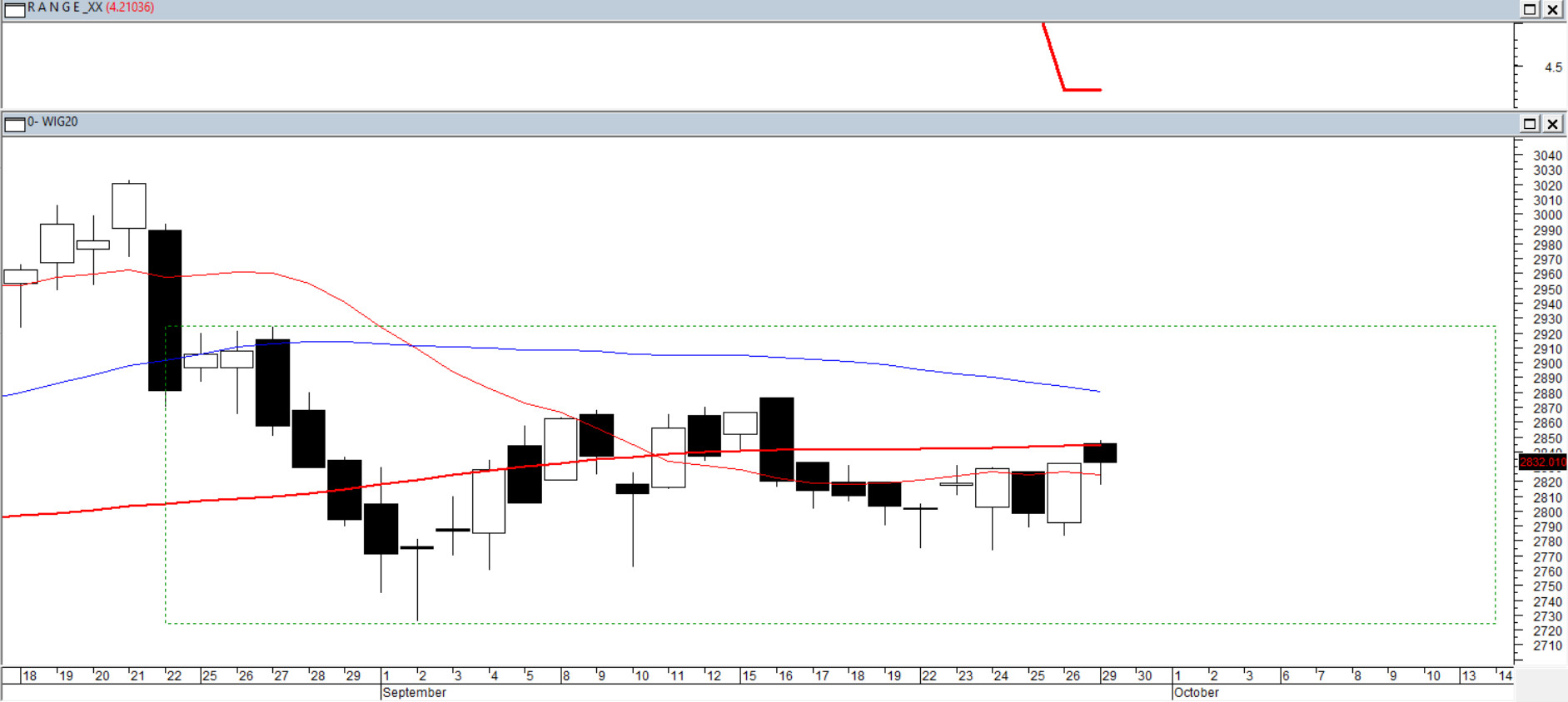 Podczas trwającej przez 5 sesji (27 VIII – 2 IX) przeceny kurs najważniejszego polskiego indeksu giełdowego zniżkował z 2924 na 2726 (ok. 200 pkt). Od tamtego czasu porusza się on w tym paśmie. Licząc w cenach zamknięć jego szerokość obniżyła (średnio z 18 sesji) się do poziomu 4,2% forsując 4,5%, pierwszy raz od poprzednich wakacji. Jednocześnie był to jeden z dwóch przypadków w ciągu ostatnich czterech lat. Takie zacieśnienie standardowo sugeruje nadejście dynamicznego lub jednostajnego ruchu trendowego. Układ średnich 15/45/100 na razie będzie wspierać podaż. Dodatkowo, z pewnością istotną rolę odgrywać będzie szczyt „Objęcia Bessy” z 16 IX z jego maksimum 2876 pkt.