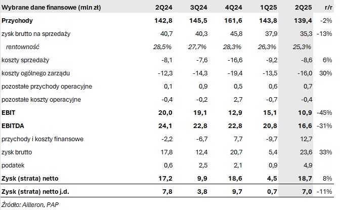 Ailleron zanotował w 2Q25 2% niższe przychody niż przed rokiem. Oczekiwaniach analityków ankietowanych przez PAP Biznes mieściły się w przedziale od 143,6 mln zł do 144,8 mln zł. Z kolei zysk operacyjny spółki w II kw. wyniósł 10,94 mln zł wobec oczekiwań analityków w przedziale od 17,3 mln zł do 17,4 mln zł. Segment Fintech przy +14% dynamice przychodów odnotowuje 0,84 mln zł straty operacyjnej. Software Mind natomiast przy przychodach niższych o 5,6 mln zł r/r, odnotowuje EBIT niższy o 9,37 mln zł rok do roku. W 2Q25 roku zmodyfikowano umowę wspólników SOFTWARE MIND CF S.R.L., usuwając z niej Opcję Put oraz wprowadzając warunki realizacji Opcji Call. W wyniku wyceny tej opcji rozpoznano aktywo finansowe o wartości ok. 17,2 mln zł, co zwiększyło pozostałe przychody finansowe Grupy.