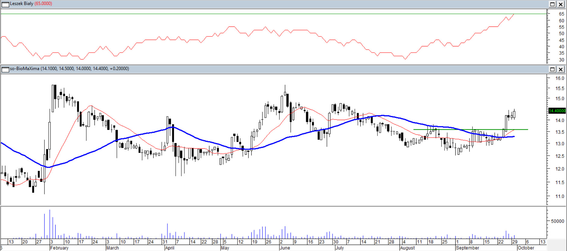 Biorąc pod uwagę ostatnie dwa miesiące notowań kurs uformował aż 65% białych korpusów. Tak duża przewaga w połączeniu z próbą ukształtowania nowych lokalnych rekordów cenowych widzianych tu na początku wakacji może również wskazywać na akumulację w pędzie. Wybicie strefy oporu 13,55-13,80 zł. cieszy krótkoterminowe byki. Układ średnich 15/45/100/200 od końca minionego tygodnia wspierać będzie przez jakiś czas popyt. Opór z pierwszych dni lipca 14,75 zł. blisko, ale nadal to strefa letargu niedźwiedzi.