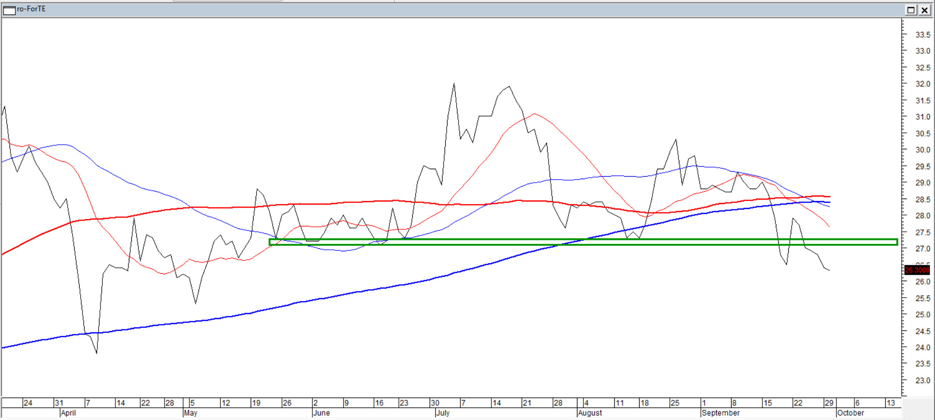 To sparafrazowane powiedzenie brydżystów jest tu użyte nieco na wyrost. Kurs spada bowiem poniżej sekwencji średnich 15/45/100/200 potwierdzając tym samym, że walor został chwilowo opanowany przez niedźwiedzie. Powrót ponad 28,60 zł. będzie przez byki mile widziany. Ale na razie popyt musi budować coś stabilnego i niekoniecznie z drewna, bo kurs znalazł się niebezpiecznie blisko poziomów zbliżonych do tych z początku maja.
