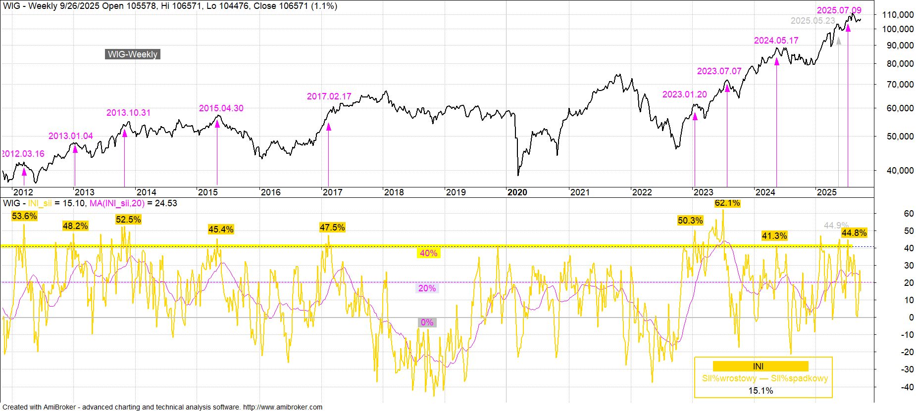 Ostatnie wyniki prowadzonego przez SII cotygodniowego badania sentymentu krajowych inwestorów indywidualnych pokazały spadek odsetka byczych oczekiwań z 53.0% do 42.4% oraz wzrost odsetka oczekiwań niedźwiedzich z 25.8% do 27.3%. W rezultacie saldo byków i niedźwiedzi (INI) obniżyło się z 27.2% do 15.1%, czyli zgodnie z oczekiwaniami skok optymizmu z poprzedniego tygodnia okazał się nietrwały. Z drugiej strony od ostatniej kulminacji sentymentu (odczyt 44.8% z początku lipca) niebawem minie 3 miesiące, a jest to czas - o czym więcej w dalszej części komentarza - kiedy próby odbudowy nastrojów są już dopuszczalne. Przypominając zaś ogólną tendencję, szczyty wskaźnika INI budowane na pułapie przekraczającym 40% (przy 20-tyg. średniej >20%) w większości historycznych przypadków poprzedzały niekorzystne zmiany na rynku akcji (fioletowe strzałki na wykresie powyżej), z tym że poza najczęstszą możliwością średnioterminowego zwrotu w dół, raz pojawił się także wariant wyhamowania wysokiego tempa zwyżek (rok 2017). Po zsynchronizowaniu i uśrednieniu wszystkich ośmiu historycznych ścieżek zachowania WIG20 po szczycie INI otrzymujemy projekcję (pogrubiona linia fioletowa na wykresie poniżej), która od początku sierpnia opada przez kolejne półtora miesiąca. Dołączono także ścieżki maksymalną i minimalną (w ujęciu drugich wartości skrajnych), które we wspomnianej wcześniej perspektywie potwierdzają kierunek głównej projekcji. Później natomiast rozpiętość między ścieżką maksymalną i minimalną zaczyna się wyraźnie powiększać sugerując, iż wpływ kontrariańskiej wymowy sentymentu bazującego na wskaźniku INI wraz z upływem około trzech miesięcy od ostatniego szczytu przestaje odgrywać istotne znaczenie.