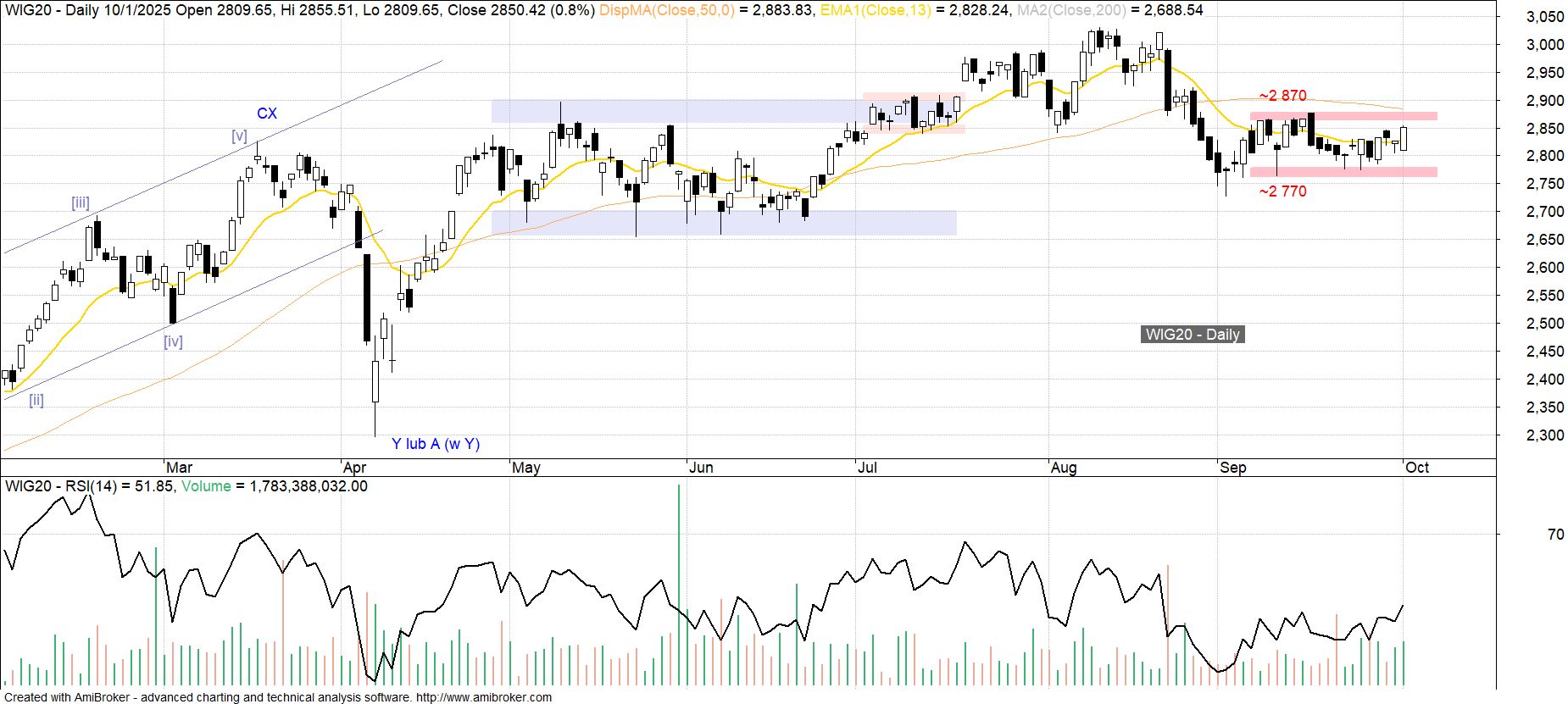 Od blisko miesiąca WIG20 pozostaje w ruchu bocznym o orientacyjnych granicach 2 770 pkt i 2 870 pkt. Kierunek wybicia będzie wiążący co do oczekiwanego kształtu koniunktury na najbliższe październikowe tygodnie, choć dopuszczalny jest także wariant dalszego przedłużenia wrześniowej stabilizacji. Z puntu widzenia zależności sezonowych bowiem, o ile październik generalnie kojarzony jest z mocno podwyższoną zmiennością, to zazwyczaj pozostawał on stabilny o ile z taką tendencją mielimy do czynienia też we wrześniu.