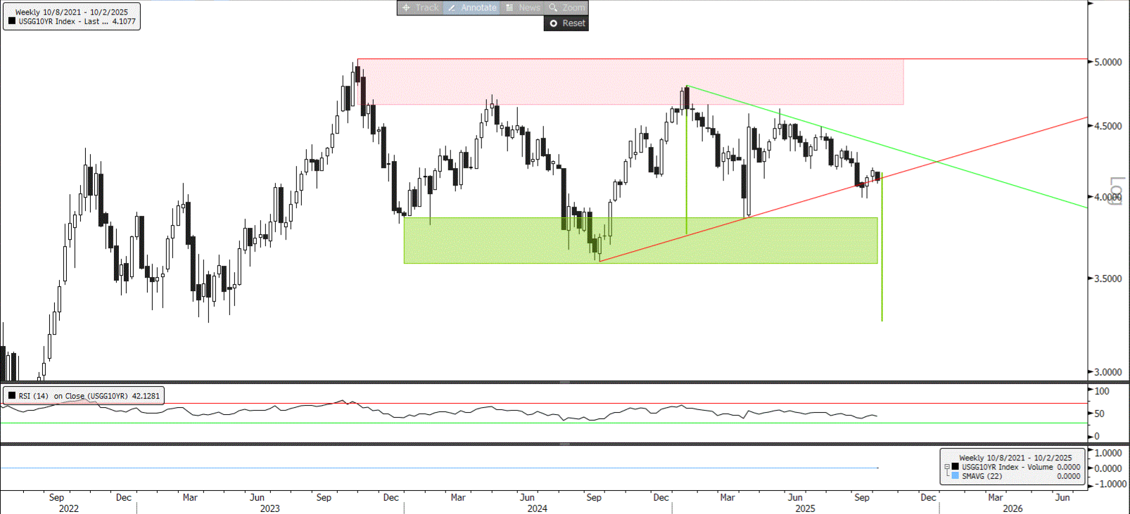 AT tygodniowy: po obronie wsparcia na ~4,0%, ale i nieudanym wyjściu ponad 4,20%, rentowności wybijają się dołem z trójkąta. Jeżeli wybicie stanie się faktem, to techniczny zasięg ruchu wynikający z trójkąta to ~3,25%.