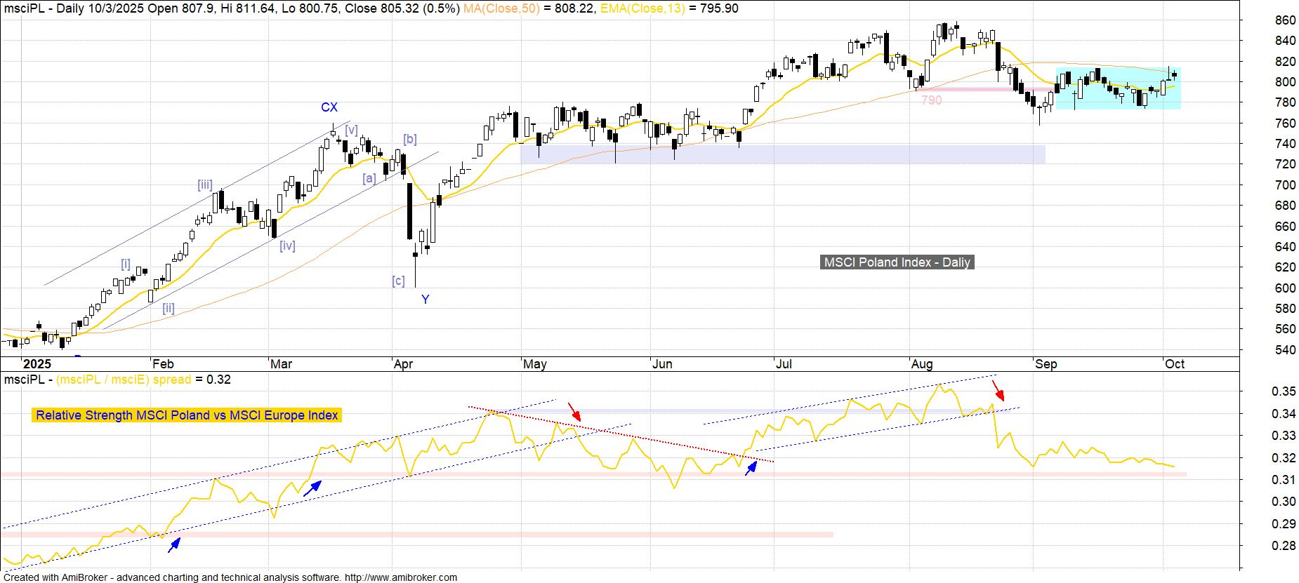 Kluczowy z punktu widzenia inwestorów zagranicznych indeks MSCI Poland od drugiego tygodnia września podlega konsolidacji w strefie 772 – 814 pkt. Na przedostatniej sesji minionego tygodnia rozpoczęta została próba wybicia górą, jednak na razie jej efektem jest jedynie symboliczne naruszenie górnego ograniczenia zakresu wrześniowych bocznych wachań. Jednocześnie zbudowana tego dnia świeca z długim górnym cieniem o niedźwiedziej wymowie (spadająca gwiazda) przemawia bardziej za zwrotem w dół niż kontynuacją próby wybicia. Optymistyczny scenariusz nie jest także faworyzowany z uwagi na utrzymującą się od dwóch miesięcy relatywną słabość, zauważalną nawet względem ostatnio najsłabszego w układzie globalnym rynku europejskiego.