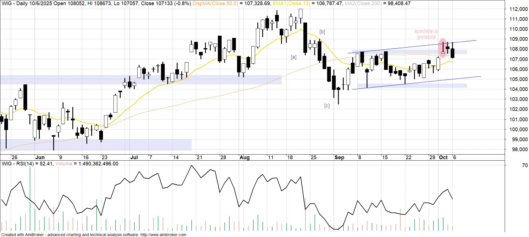O ile po nieudanej czwartkowej próbie opuszczenia górą zarysowanej we wrześniu konsolidacji, neutralna sesja piątkowa dopuszczała jeszcze możliwość jej ponowienia, to sesja wczorajsza opowiada się już mocniej za wariantem lokalnego zwrotu w dół. Spadek poniżej czwartkowego minimum podkreśla bowiem niedźwiedzią wymowę zbudowanej tego dnia świecowej formacji spadającej gwiazdy. Natomiast w kontekście trwającej niemal od początku września konsolidacji można zaś mówić co najwyżej o zmianie jej kształtu z typowej tendencji horyzontalnej na symbolicznie nachylony w górę kanał trendowy.