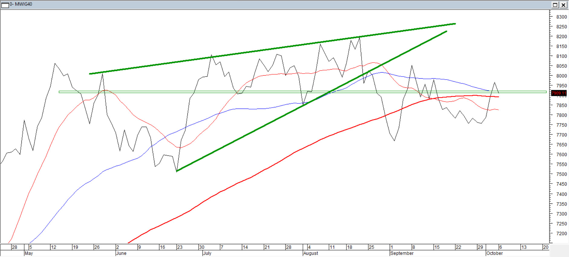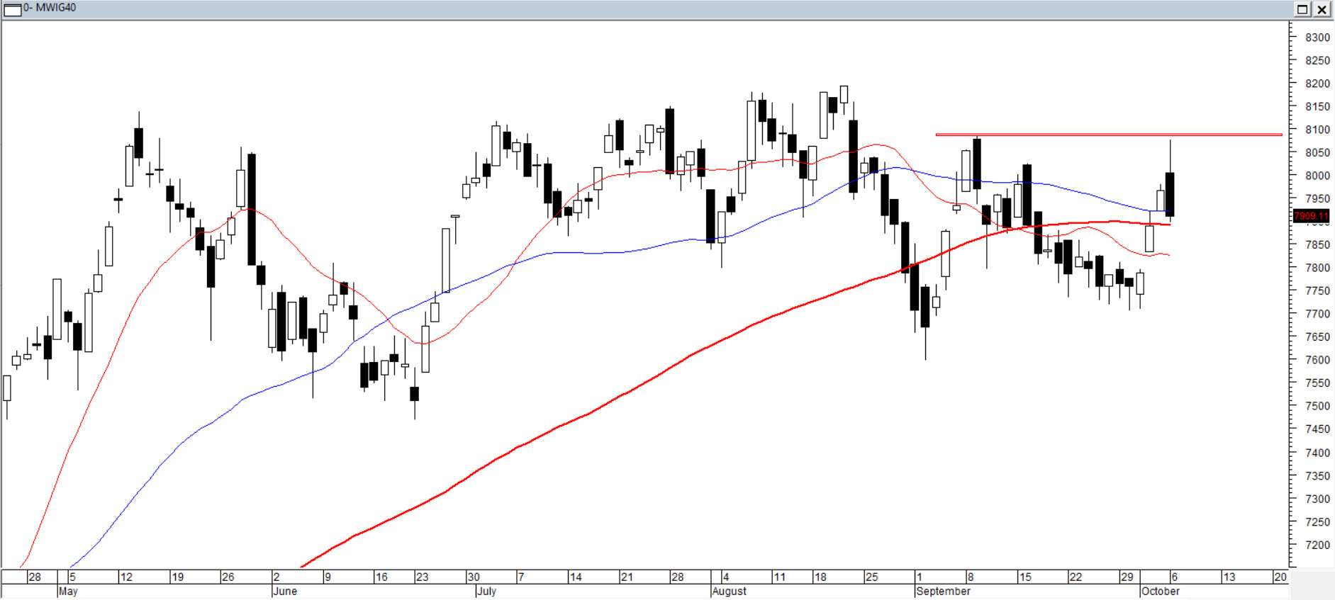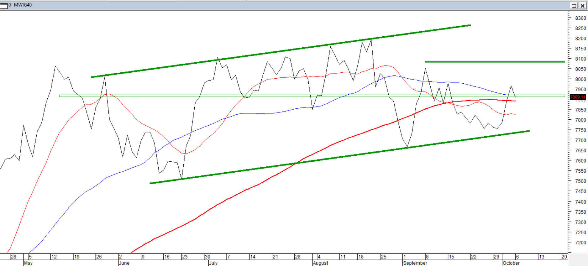 Podczas poniedziałkowej sesji indeks średnich spółek obniżył się o 0,87%. Na wykresie doszło do ukształtowania spadkowej formacji "Objęcia Bessy". Powstała ona w strefie oporu, wrześniowego maksimum. To nieco komplikuje sytuacje w obozie byków, choć wrześniowe dołki jako wsparcie są nie tylko bezpieczne, ale i względnie daleko. Pesymiści widzą wybicie z wakacyjnego klina zwyżkującego dołem i odnosi się wrażenie, że czegoś w dół tu nadal brakuje. Optymiści widzą szeroki kanał wzrostowy, który ciągnie się od końca maja. Średnie 15/45/1100 są ułożone w sposób typowy dla nudnego ruchu bocznego.