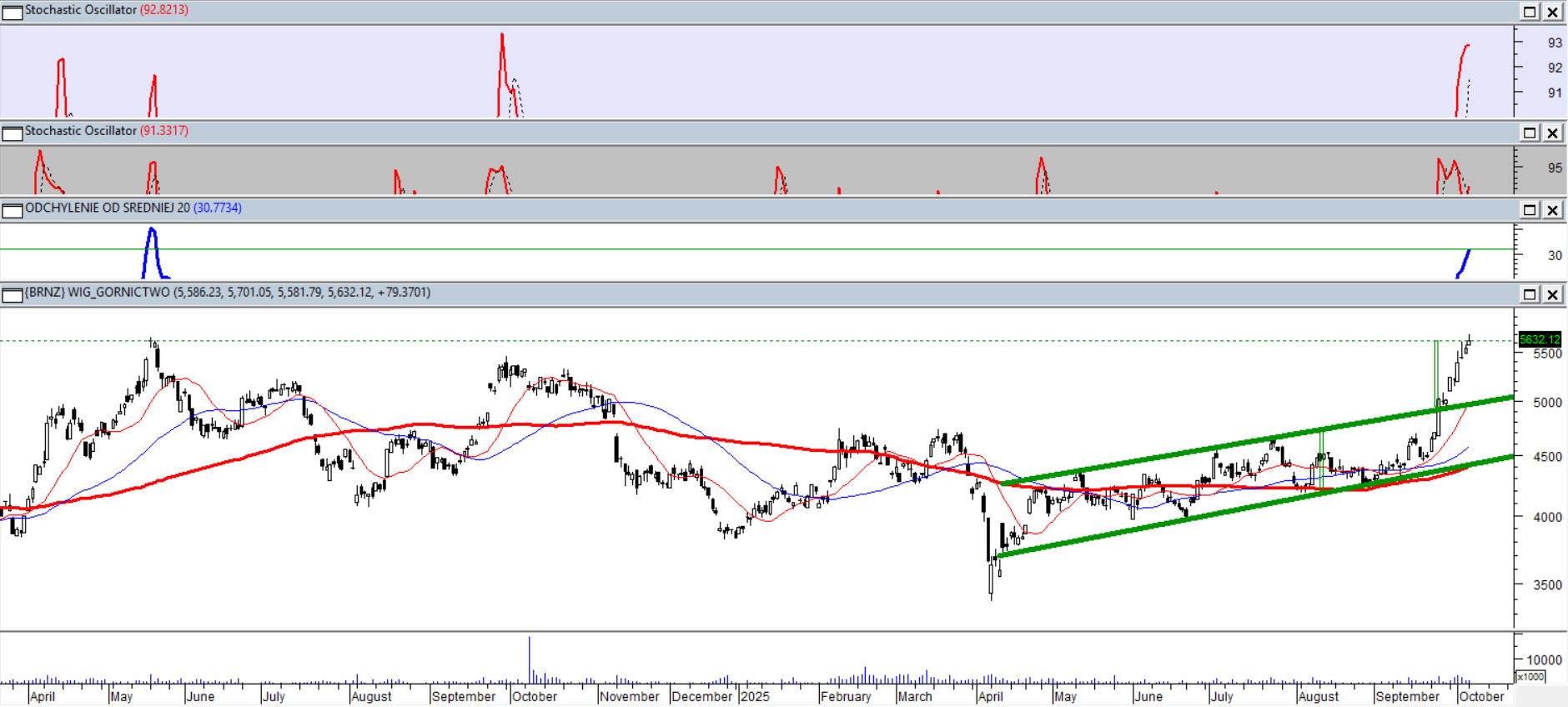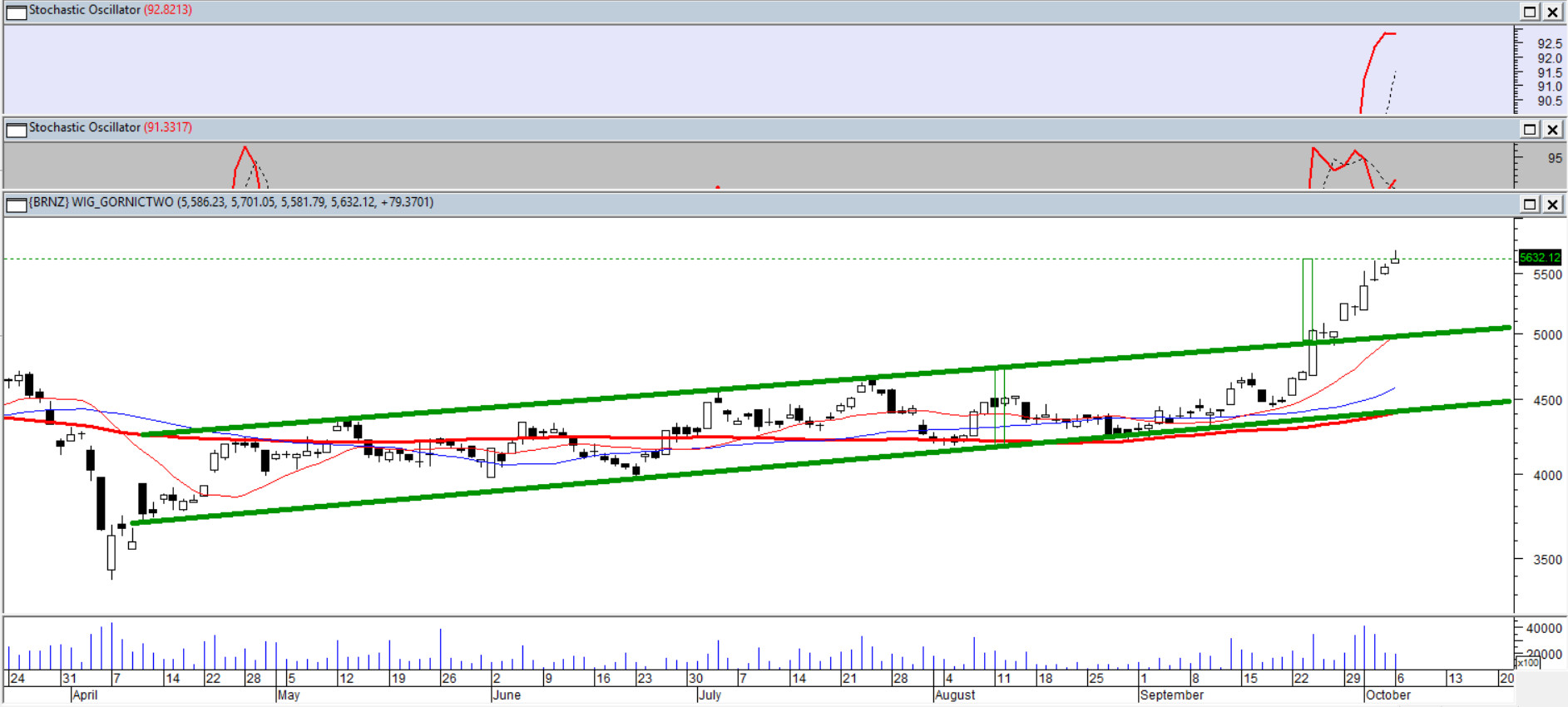 Od Świąt Wielkiej Nocy do drugiej połowy grudnia kurs branżowego "górnika" poruszał się w klasycznym kanale wzrostowym, który dwa tygodnie opuścił górą. Podczas poniedziałkowej sesji doszło do realizacji pierwszego z zasięgów - o wysokość wspomnianego kanału. Zaczyna trochę niepokoić ekstremalne wykupienie oscylatorów tak szybkich jak i wolnych, zapraszając tym samym do wykonania korekty większego rzędu, ale pod tak dynamicznej zwyżce taki stan jest w pełni uzasadniony. Średnie 15/45/100 ułożone są w sposób charakterystyczny dla kontynuacyjnego dość silnego trendu wzrostowego. Odchylenie od średniej z 200 sesji osiągnęło poziom +30% czyli podobnie jak w przypadku osiągnięcia ekstremum w maju ub. roku.