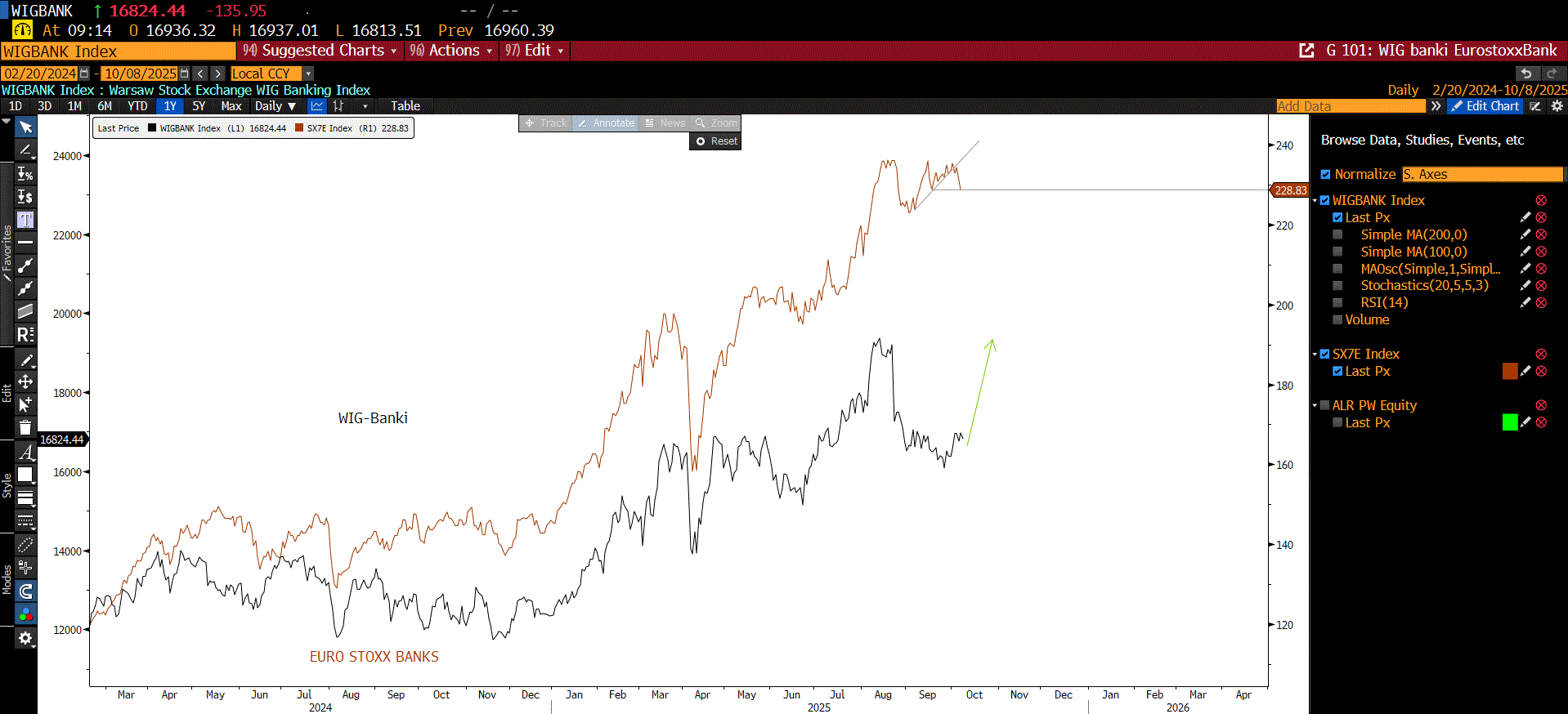 EuroStoxx Banks vs. WIG-Banki: Zastanawiającą kwestią są symptomy wyczerpywania się siły EuroStoxx Banks, czego aktualnym katalizatorem jest obawa o przedterminowe wybory we Francji (w środę prezydent Macron może podjąć decyzję o rozwiązaniu parlamentu).