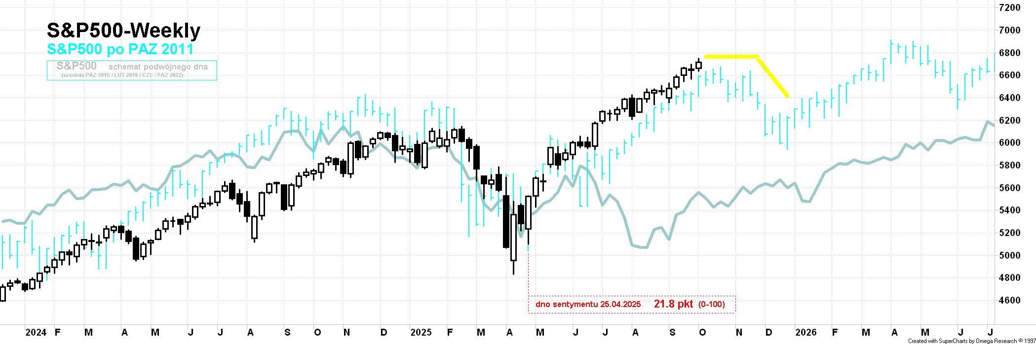 Syntetyczny wskaźnik sentymentu uśredniający znormalizowane do przedziału 0-100 pkt cotygodniowe wskazania Investors Intelligence (biuletyny inwestycyjne), NAAIM (aktywni zarządzający) oraz AAII (inwestorzy indywidualni) od początku lipca stabilizuje się po wcześniejszym dwumiesięcznym mocnym odbiciu z jednej z najniższych w ostatnim dziesięcioleciu wartości 21.8 pkt. Co szczególnie warte podkreślenia, ten odnotowany w kwietniu odczyt lokuje się już w zakresie 14.3 – 24.7 pkt, gdzie w ostatnich czterech cyklach formowały się kontrariańskie dna sentymentu. Interpretacja skrajnie niskich odczytów sentymentu (w przeciwieństwie do odczytów skrajnie wysokich) jest dość jednoznaczna – pojawiają się one praktycznie jednocześnie z dnami bessy na rynku akcji. Należałoby przy tym dokonać rozróżnienia na schemat ‘pojedynczego dna’ (jak w październiku 2011 i marcu 2020) oraz ‘podwójnego dna’ (październik 2015 / luty 2016 i czerwiec/październik 2022). Zasadniczo jeszcze do końca pierwszego półrocza trudno było ocenić, który z tych wariantów ma większe szanse pojawić się obecnie, jednak dwie wysokie tygodniowe białe świece S&P500 z przełomu czerwca i lipca już bardziej zdecydowanie opowiedziały się za opcją szybkiego odbicia z ‘pojedynczego dna’. Podobnie można interpretować fakt, iż wskaźnik syntetyczny zdołał na dłużej zadomowić się powyżej pułapu 60 pkt, co w przeszłości zawsze sygnalizowało, iż pierwsza kontra podażowa w nowo rodzącej się hossie nie okaże się głęboka, mając jedynie typowo korekcyjny charakter. Schemat ‘pojedynczego dna’ został zobrazowany na wykresie ścieżek zachowania S&P500 po kontrariańskich dnach sentymentu przez ścieżkę zapoczątkowaną w październiku 2011 (pominięcie przypadku z marca 2020 o skrajnie wysokiej zmienności podyktowane jest względami przejrzystości wykresu). Gdyby podobieństwo do tej ścieżki było nadal utrzymane, w IV kwartale 2025 powinny pojawiać się oznaki stopniowego przechodzenia do spadkowej korekty.