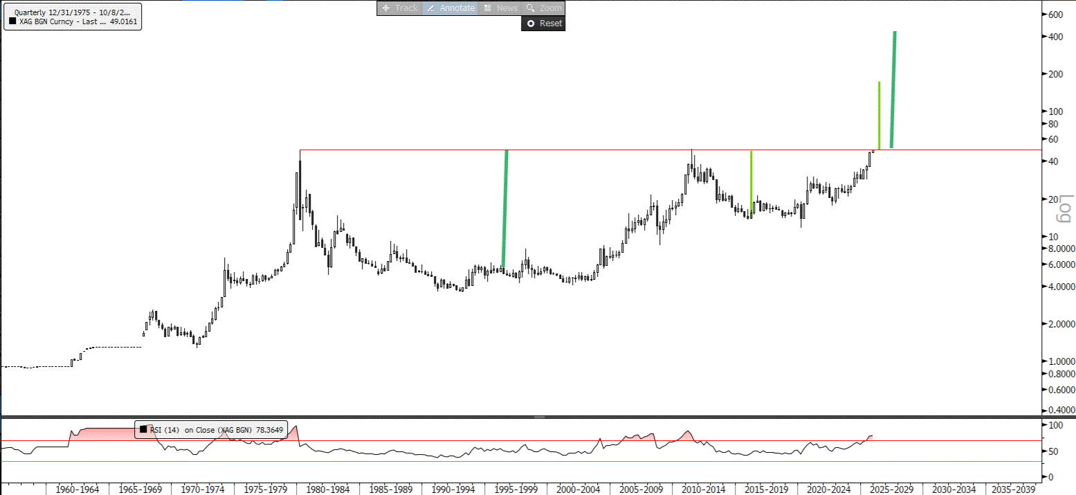 Srebro jest na ~49,14 USD za uncję,