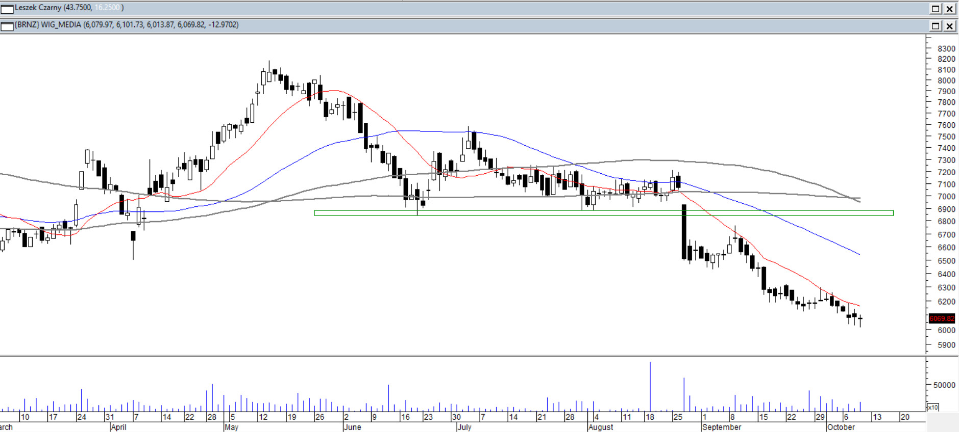 Sposób poruszania się branżowych mediów należy w tym roku do najbardziej niedźwiedzich w swojej historii. Szybkim tempem zbliżamy się oto do 3-letnich minimów. Bardzo słabą koniunkturę potwierdza też ułożenie kursu w stosunku do średnich 15/45, który przebywał od początku czerwca ponad obiema raptem przez jeden dzień. Jest tu oczywiście niskie wyprzedanie oscylatorów, ale ono póki co nie zachęca uczestników rynku do żwawszej akcji nastawionej na odwrócenie tendencji. Odchylenie kursu od średniej ze 100 sesji osiąga poziomy, gdzie wcześniej taka próba była historycznie podejmowana. Jednak udział biały korpusów (większych niż 0,5%) jest relatywnie i niski. Tu czarne od kilku tygodni górują, przewaga wzrosła jak 3:1, co potwierdza niepodważalną dominację niedźwiedzi.