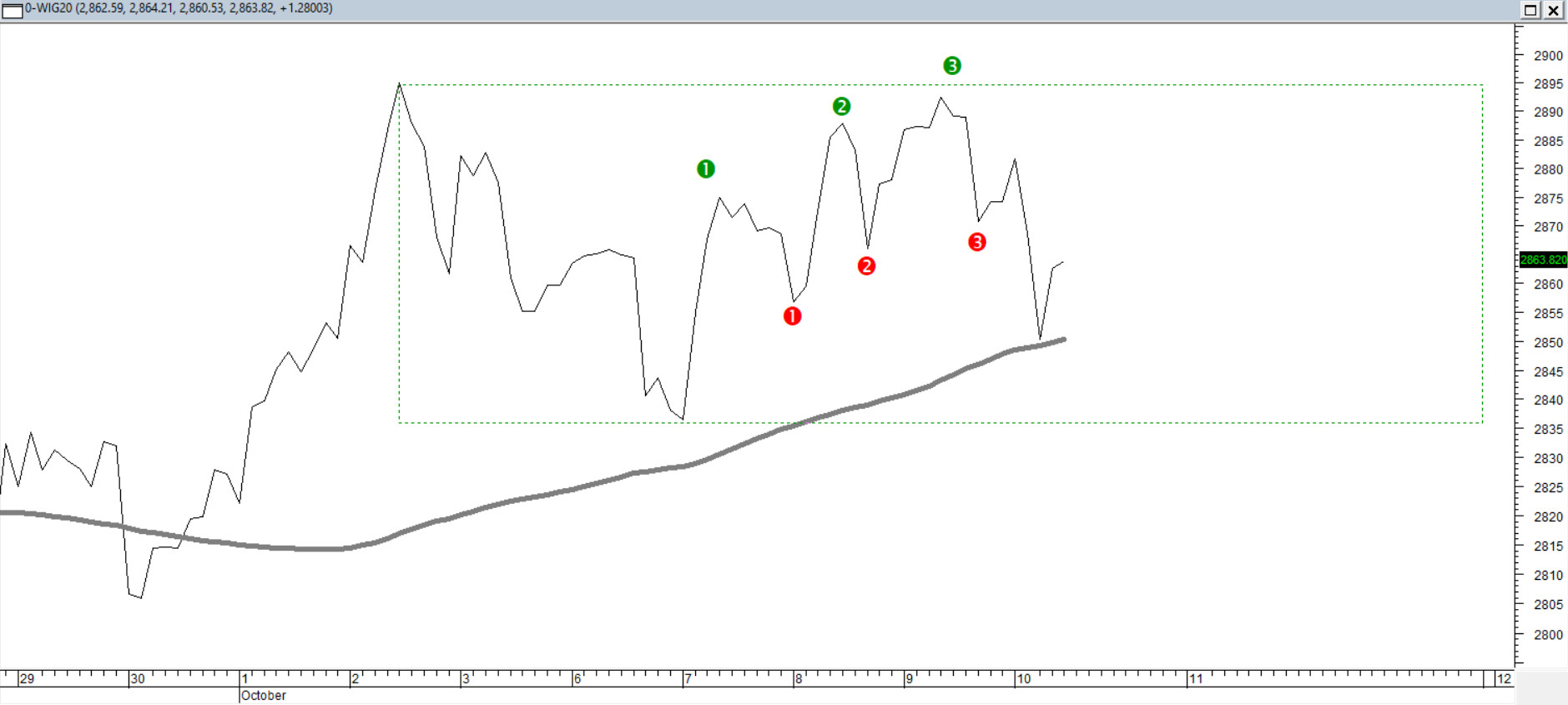 Obie strony w tym tygodniu wyraźnie "bawią się" w przeciąganie liny. Kurs porusza się w strefie pasma zmian z okresu ubiegły czwartek - wtorek rano. Mozolna próba utrendowienia w kierunku wzrostowym (wyższe dołki i szczyty) zakończyła się dziś złamaniem, co może wskazywać na większą predyspozycję jednak do spadków kursu. Mimo to ten układ nie preferuje żadnej ze stron, a średnia ze 100 godzin nadal utrzymuje byki w grze. Należy założyć, że wybicie strefy 2835 - 2895 pkt. w jedną ze stron może zwiększyć przejrzystość sytuacji rynkowej dla obserwatorów.