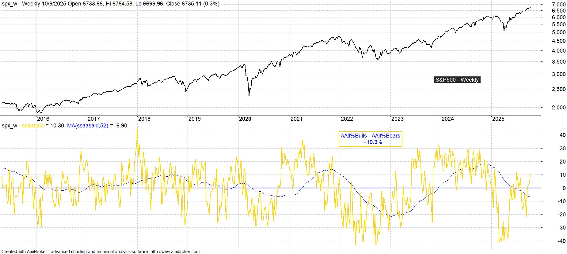 Ostatnie wyniki sondażu The American Association of Individual Investors pokazały wzrost odsetka byczych oczekiwań z 42.9% do 45.4% oraz spadek odsetka oczekiwań niedźwiedzich z 39.2% do 35.6%. W rezultacie saldo byków i niedźwiedzi (AAII%Bulls – AAII%Bears) wzrosło z 3.7% do 10.3%, co od kwietnia, czyli od początku obecnej fali hossy jest dopiero dziesiątym dodatnim odczytem salda. Jego roczna średnia krocząca znajduje się natomiast w strefie wartości ujemnych i nadal opada. Tymczasem dopóki wspomniana średnia nie ulokuje się na dłużej na plusie, z kontrariańskiego punktu widzenia nie będzie przesłanek do zakończenia obecnej hossy.