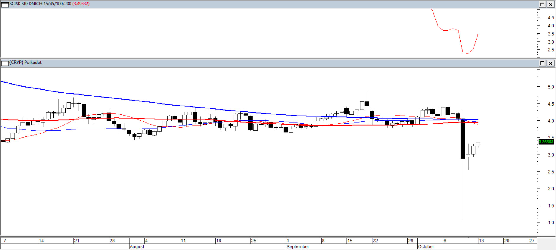 To kryptowaluta, która pod względem kapitalizacji plasuje się w środku trzeciej dziesiątki, a to znaczy, że uchodzi za dość płynną. W trakcie piątkowej sesji nastąpił "nieoczekiwany" przelot z ok 4$ do 1$. Kurs po drodze obniżył się zatem o blisko 3/4. Końcówka dnia należała już do popytu i duża część strat została odrobiona. Kurs przez weekend i poniedziałek nadal rośnie, ale czarny korpus (i cień) z piątku będzie długo straszył. Wzmożonego "zainteresowania" i ewentualnie dynamizowania można się było jednak trochę spodziewać. W ostatnich dniach ścisnęły się średnie 15/45/100/200 do poziomu 2,5%, niespotykanego w historii tej kryptowaluty. A to zazwyczaj oznacza wejście we właściwy dłuższy trend albo krótki, ale za to "mocny" ruch. Albo jedno i drugie. W każdym razie ten, co czekał z kupnem nieopodal ceny 1 USD wygrał los na loterii, oczywiście pod warunkiem, że gdzieś po drodze tę pozycję zamknie dla siebie satysfakcjonująco.