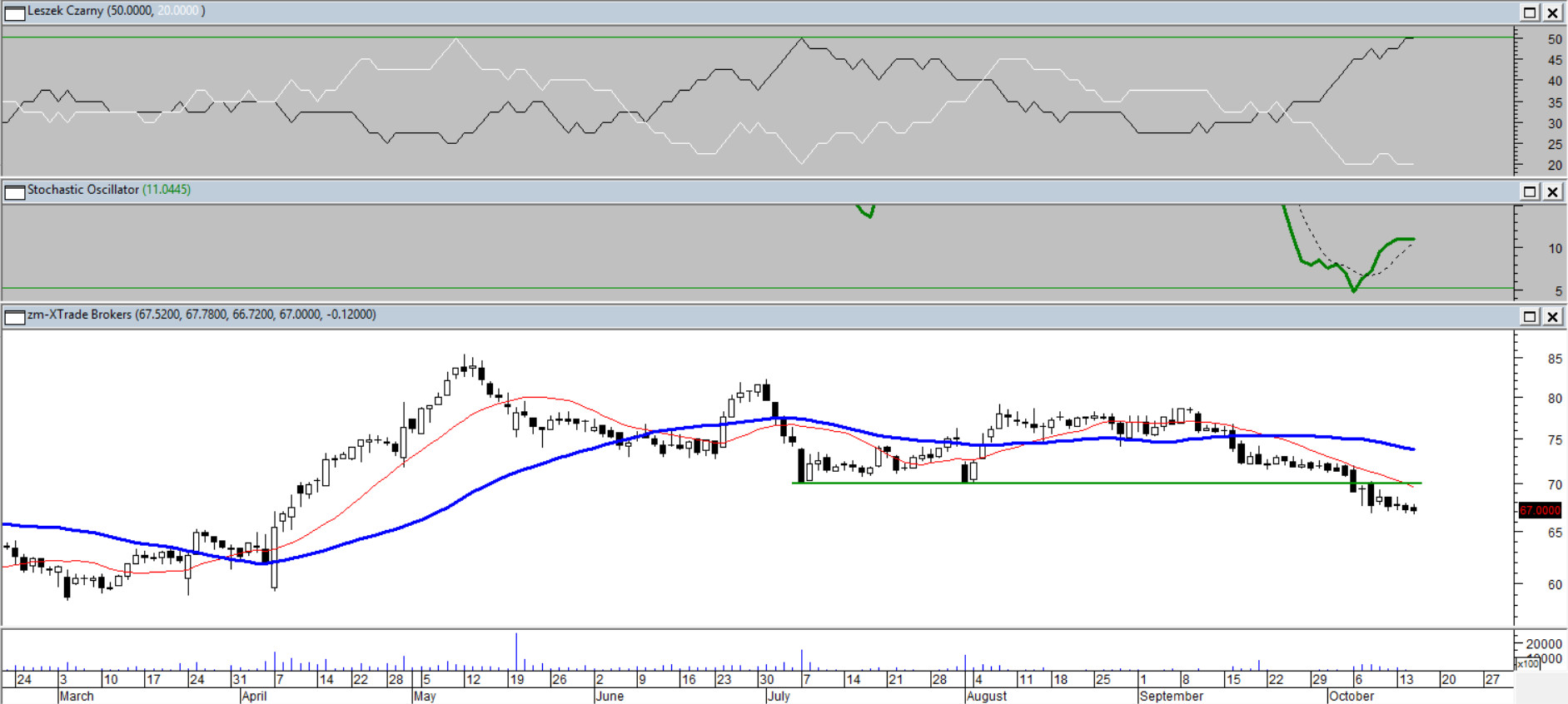 Ostatnie sesje przynoszą pogłębianie ruchu spadkowego, a kurs znalazł się najniżej od początku kwietnia. Byki nie mogą być zadowolone z tego stanu rzeczy, tym bardziej, że przewaga podaży nad popytem (korpusy ponad 0,5%) wzrosła jak 5 do 2. Taki stosunek w trakcie ostatnich lat (także 2 do 5) kończył dotychczasową tendencję oznaczał odwrócenie. O sile trendu spadkowego może świadczy fakt, że oscylatory wolne tak rzadko odnotowujące poziomy jednocyfrowe charakteryzujące skrajne wyprzedanie kursu osiągnęły kilka sesji taki stan pierwszy raz od dołka z jesieni 2018 roku.