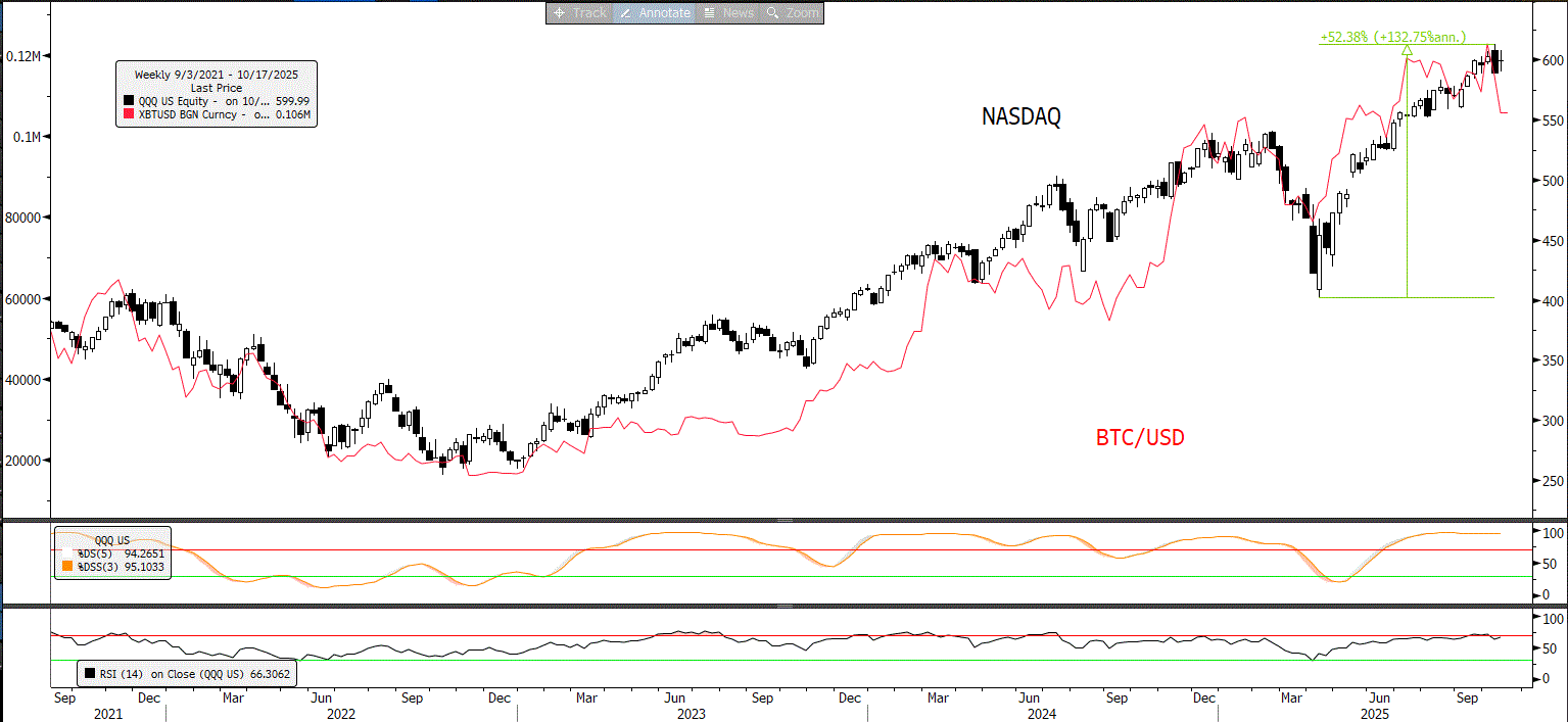 NASDAQ jest silnie skorelowany z bitcoinem (~korelacja rzędu 0,9). Wyraźna korekta BTC/USD jest czynnikiem ostrzegawczym dla NASDAQ w szczególności po odbiciu o 52% od dołka z kwietnia br.