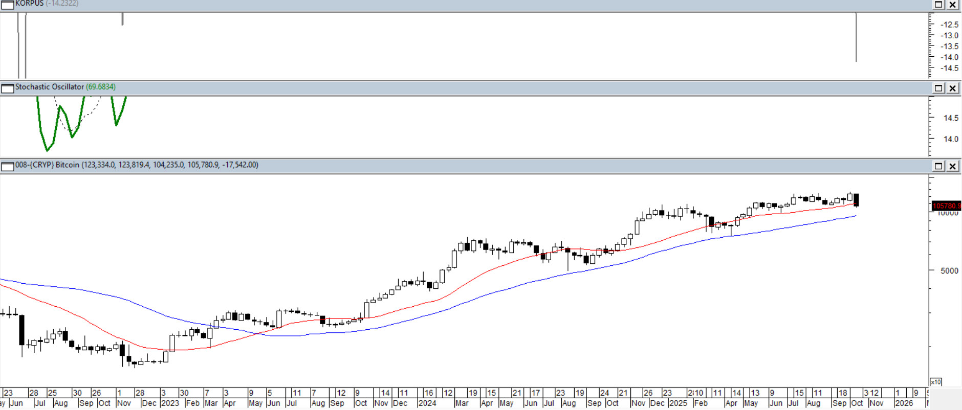 Godzina jeszcze młoda i do końca giełdowego dnia jest sporo czasu, ale na tę chwilę najważniejsza kryptowaluta spada najmocniej w sekwencji 9-cio dniowej od czerwca 2022. Fani tej cyfrowej waluty (a zwłaszcza wzrostów kursu) wprawdzie pocieszają się, że do średniej z 20 i 45 jednostek (prowadzą trend od dłuższego czasu) jest jeszcze daleko, ale sytuacja robi się poważna. Na wykresie dziewięciodniowych świec pojawiła się spadkowa formacja "Objęcia Bessy", a oscylatory tak wolne jak i szybkie nie osiągnęły jeszcze stanu sugerującego powolne wyczerpywanie potencjału spadkowego.
