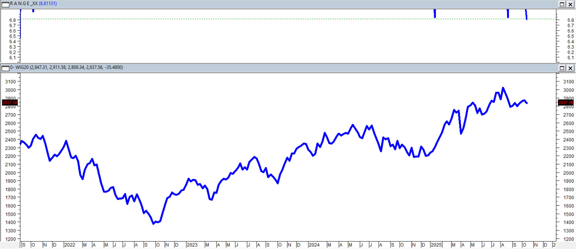 Dla uczestników rynku spekulujących w małych perspektywach czasowych z pewnością dzieje się. Tacy, gdy kurs porusza się w kanałach preferują wychylenia oscylatorów do otwierania pozycji. Tak więc wychylanie oscylatorów (póki nie dojdzie do klasycznego utrendowienia) daje podniesione szanse wyłapywania krótkoterminowych punktów zwrotnych(dołków i szczytów). Wszystko do czasu, czyli jest dobrze dopóki kurs nie wejdzie w nieco większy trend. Szybki dzisiejszy przelot do strefy dolnego ograniczenia formowanego kanału zapewne znów pobudzi wyobraźnię wielu. Do czasu. W dłuższej perspektywie nic ważnego nie dzieje się, Emocje jak podczas zbierania grzybów. Rozrzut pomiędzy ekstremami z ostatnich 8 tygodni spadł do najniższego od 4 lat poziomu.