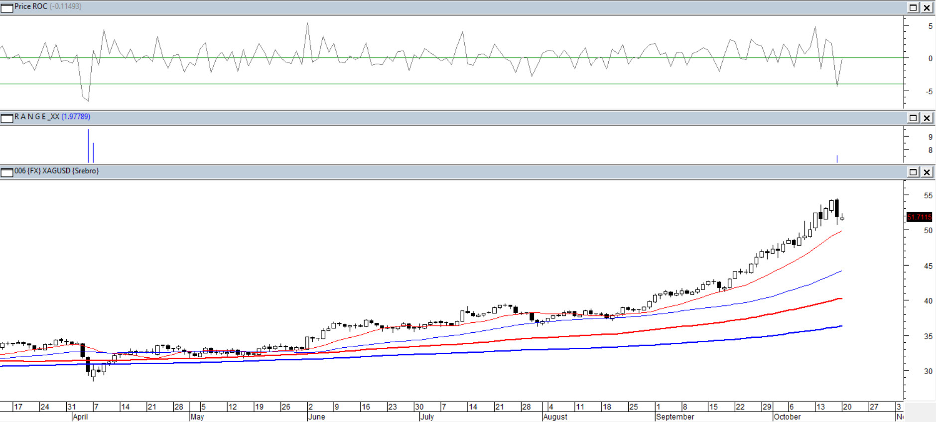 Notowania srebra zakończyły piątkową sesję silnym spadkiem o 4,4%, co stanowi największy jednodniowy zjazd od kwietnia. Co więcej, dzienny przelot na poziomie 7,5% również jest rekordowy dla tego okresu, co podkreśla skalę nerwowości na rynku metali szlachetnych nie tylko tego instrumentu. Po serii dynamicznych wzrostów pojawiła się świeca o kształcie klasycznego „objęcia bessy”, zwiastująca możliwy koniec ostatniej fali euforii. Kurs zsunął się z lokalnych maksimów w okolice 51,7 USD, jednak wciąż pozostaje powyżej krótkoterminowych średnich kroczących. Dopiero ich wyłamanie mogłoby wzmocnić sygnał korekcyjny. Dynamika ruchu i zakres zmienności sugerują, że emocje nie opadną szybko – rynek będzie musiał znaleźć nowe punkty odniesienia po tak gwałtownym wstrząsie.