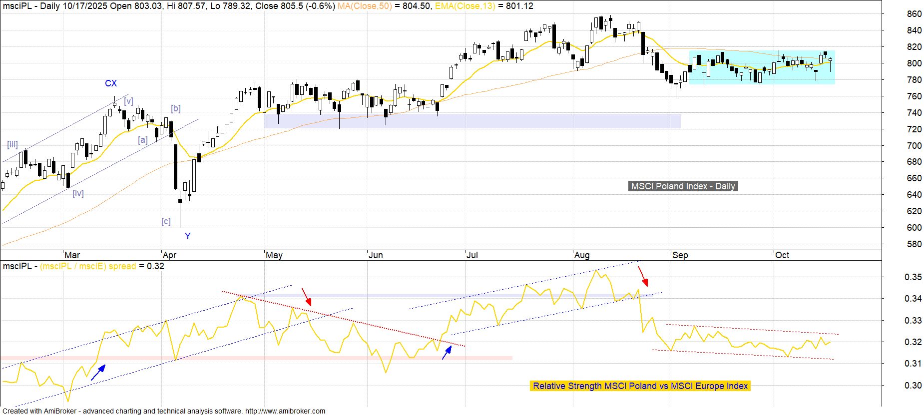 O ile od ubiegłego piątku można mówić o mocnym rozchwianiu globalnej koniunktury, to podwyższona zmienność jest nadal praktycznie niezauważalna w segmencie krajowych dużych spółek. Kluczowy z punktu widzenia inwestorów zagranicznych indeks MSCI Poland nawet nie podjął próby opuszczenia dość wąskiej konsolidacji 772 – 814 pkt, jaka trwa niemalże od początku września. Mimo, że utrzymanie ruchu bocznego z ostatnich sesji oznacza lepsze zachowanie względem rynków bazowych, to w perspektywie wspomnianej wcześniej konsolidacji nadal mamy do czynienia ze spadkową tendencją wskaźnika Relative Strength MSCI Poland vs MSCI Europe Index, co niezmiennie nie faworyzuje pozytywnego rozwiązania, jakim byłoby w tym przypadku wybicie górą.