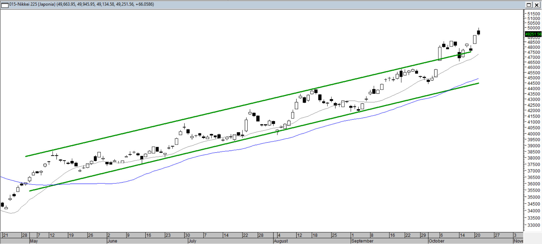 Wykres dzienny Nikkei przypomina japońską precyzję w ruchu trendowym – długie, równe fale, żadnego chaosu. Po krótkim zatrzymaniu indeks już na początku września wrócił ponad średnie 15 i 45, utrzymując czysty rytm wzrostowy. Struktura pozostaje czytelna, a rosnący ADX(14) wskazuje na wznowienie impetu. Warto jednak pamiętać, że poziom 38 pkt to już strefa trendu dojrzałego. Średnie 15/45/100 poruszają się w sposób charakterystyczny dla silnego trendu wzrostowego. Wsparcie w rejonie 44 500 pkt jest dość odległe, a o oporach trudno mówić, gdy kurs notuje historyczne maksima. Układ świec nie zdradza oznak wyczerpania trendu. Wykres dotarł do momentu, w którym równie naturalnie wyglądałoby krótkie schłodzenie, jak i dalsza zwyżka. Japońska giełda od dawna jedzie już na piątym biegu i znów wciska gaz – w końcu to „Highway Star”, a nie „Country Road”.