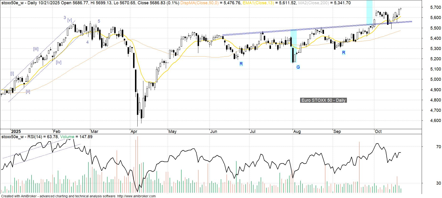Indeks 50-ciu blue-chipów strefy euro na początku października zdołał przełamać lekko nachyloną w górę linię podażową poprowadzoną przez lokalne szczyty z lipca i sierpnia, którą w tej sytuacji można traktować jako linię sygnalną kilkumiesięcznej formacji odwróconej głowy z ramionami (mniej typowa postać formacji kontynuacji). Mimo głębokiego ruchu powrotnego z ubiegłego piątku wybicie zostało obronione, a po poniedziałkowym wyjściu na nowe historyczne rekordy nie ma przeszkód do realizacji potencjału wzrostowego sugerowanego przez wysokość opuszczonej formacji (ok. 5 850 pkt).