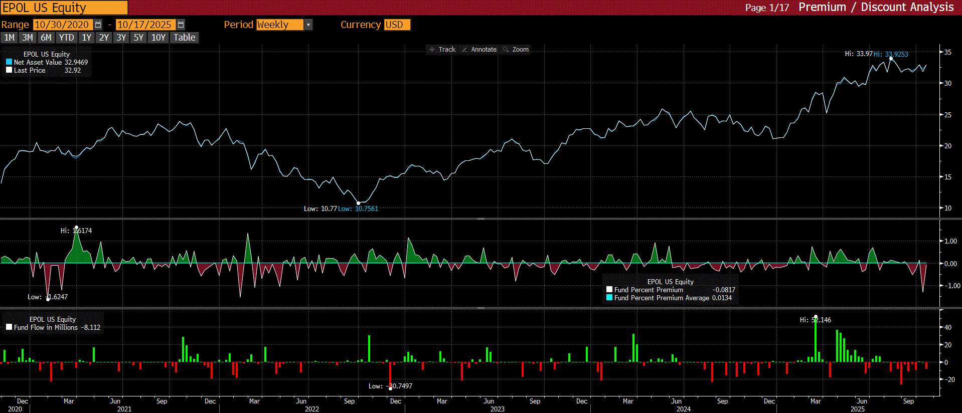 ETF na Polskę (EPOL) jest na poziomie 31,70 (ATH na 33,93).