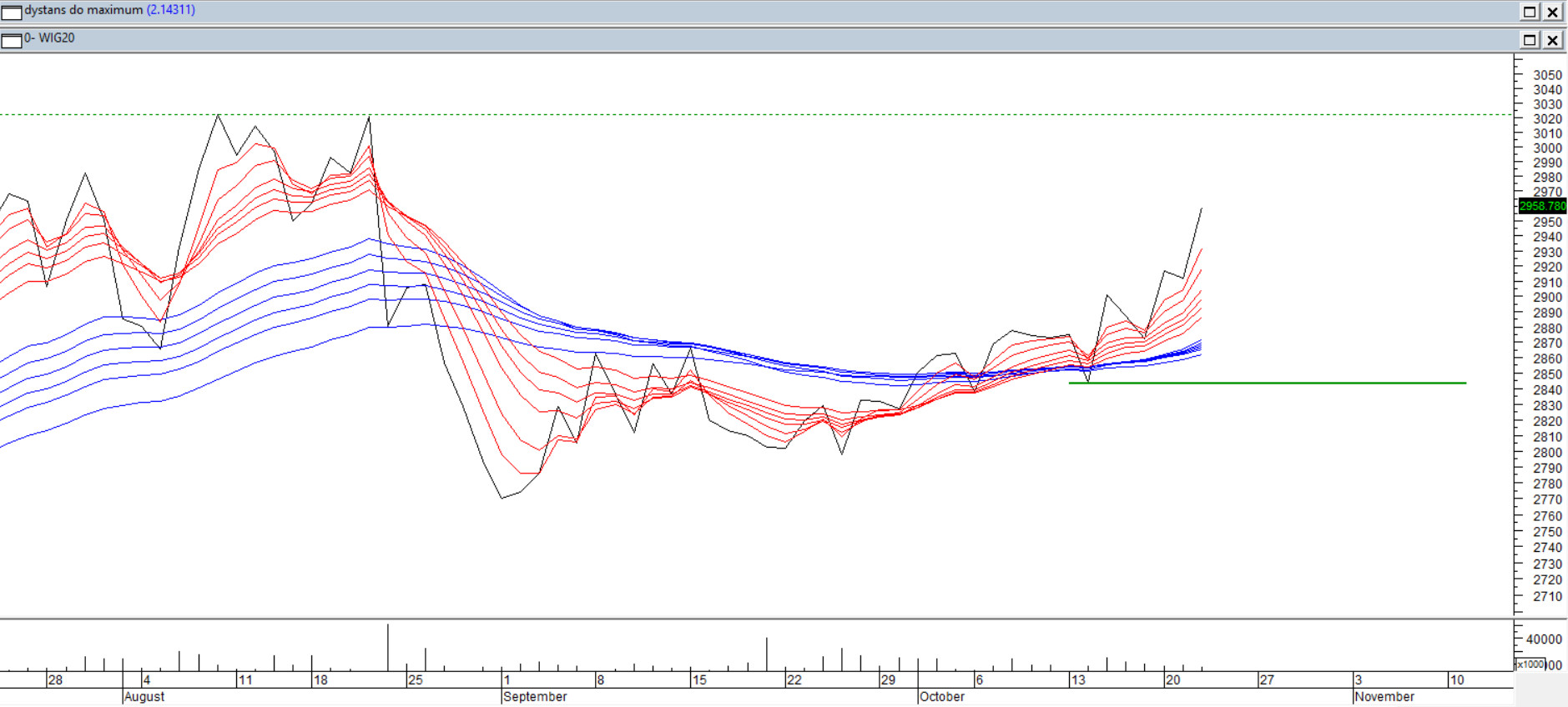 Dziś rzut oka na najważniejszy krajowy indeks z perspektywy średnich wykładniczych Guppy’ego – australijskiego analityka, twórcy koncepcji kompresji średnich EMA. Sygnał obowiązujący (jedna z krótkoterminowych średnich przebiła strefę średnioterminowych) pojawił się w pierwszych dniach października. Dopóki pierwsza z krótszych EMA nie znajdzie się pod wiązką średnich średnioterminowych – dotąd obowiązuje scenariusz wzrostowy. Sygnałem odwrotnym będzie najprawdopodobniej dopiero wybicie październikowego minimum – 2844 pkt. Na dziś dystans do tegorocznego maksimum wynosi już tylko 2,14%.
