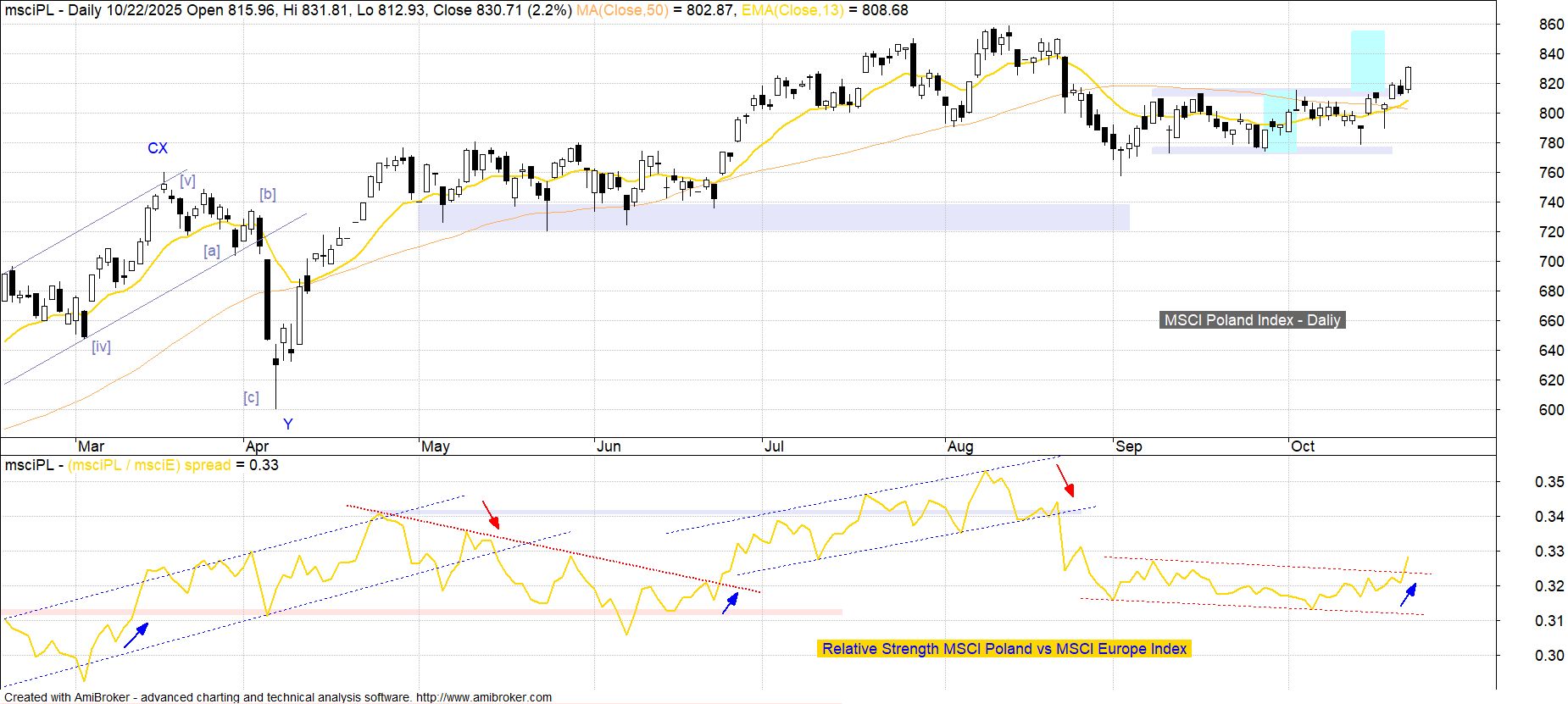 Kluczowy z punktu widzenia inwestorów zagranicznych indeks MSCI Poland na początku bieżącego tygodnia w końcu podjął długo odwlekającą się próbę ruchu ponad wynoszące 814 pkt górne ograniczenie konsolidacji, pod znakiem której upłynęło ostatnie półtora miesiąca. Utrzymanie wybicia wiąże się potencjałem wzrostowym odpowiadającym szerokości konsolidacji (855 pkt), co na chwilę obecną jeszcze nie pozwala oczekiwać przekroczenia tegorocznego szczytu 859 pkt z połowy sierpnia. W obszarze siły relatywnej warto podkreślić wczorajsze wyjście wskaźnika Relative Strength MSCI Poland vs MSCI Europe Index z opadającego kanału trendowego budowanego od początku września, co zmniejsza niepewność zarówno co do utrzymania wybicia z konsolidacji, jak i w kwestii realizacji związanego z tym potencjału wzrostowego.