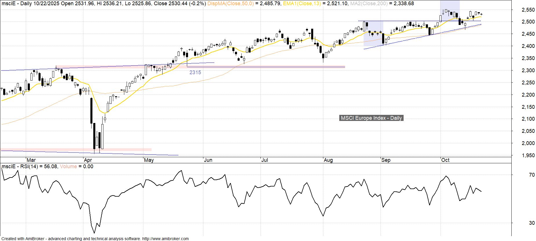 Dla skupiającego 15 europejskich rynków rozwiniętych indeksu MSCI Europe wyznaczenie nowego rekordu wszechczasów po ostrej przecenie z pierwszej połowy kwietnia okazało się kwestią niespełna miesiąca, co wypada uznać za duże pozytywne zaskoczenie, z którym wiąże się sygnał wejścia w nową falę hossy po blisko rocznej rozszerzającej się konsolidacji. W tej perspektywie główną linią obrony pozostaje pułap 2 315 pkt. Na krótką metę natomiast dzięki odzyskaniu pułapu 2 502 pkt można mówić o ponowieniu wybicia górą z blisko 2-miesięcznego trójkąta i ponownych szansach na ruch odpowiadający szerokości opuszczonej formacji (ok. 2 600 pkt).