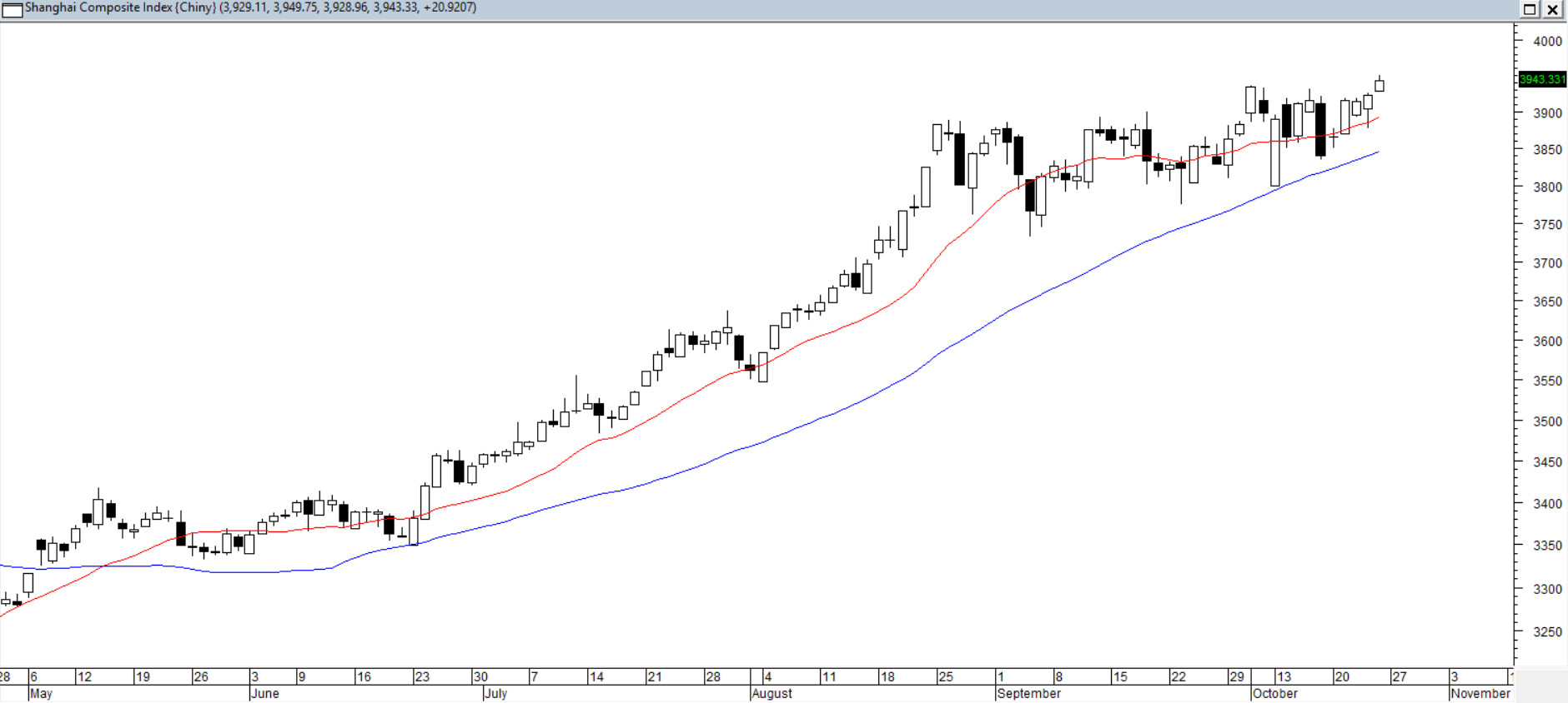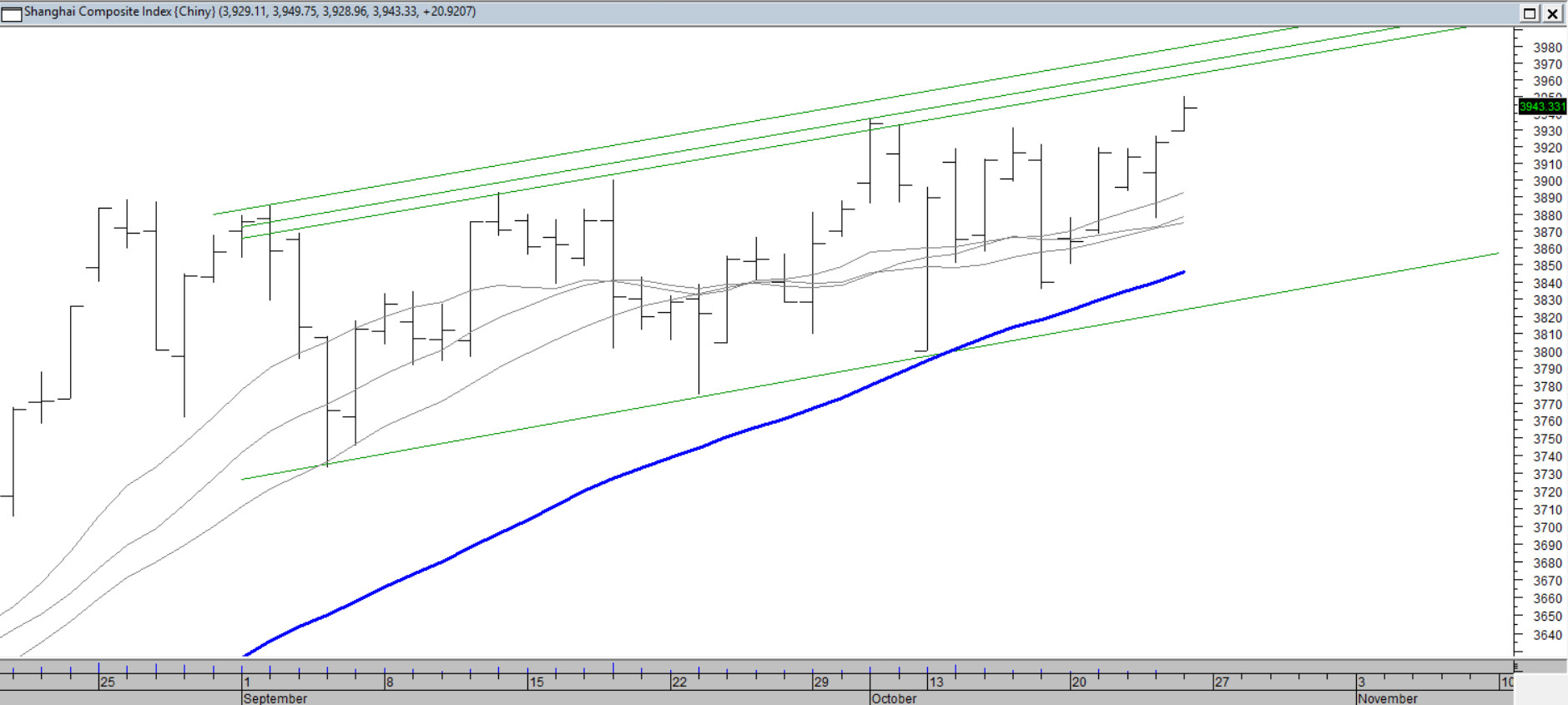 Jesień przebiega dokładnie po myśli byków. Wąski, systematycznie wspinający się kanał wzrostowy po kilku tygodniach cierpliwego marszu wyniósł indeks na nowe tegoroczne maksima – najwyższe poziomy od 2015 roku. Kurs zbliża się do górnego ograniczenia kanału, co zazwyczaj bywa powodem do lekkiego niepokoju, ale tym razem inwestorzy z Szanghaju mogą mówić raczej o satysfakcji niż o strachu. Trend wzrostowy pozostaje nienaruszony, a świece wciąż układają się w rytmie spokojnej, zdrowej zwyżki. Średnie krótkoterminowe są ułożone wzorcowo – równolegle i rosnąco, w typowy sposób dla „leniwego ruchu wzrostowego”. Od maja średnia SK-45 konsekwentnie prowadzi trend, pozostając najpewniejszym punktem odniesienia. Nic nie zapowiada końca tego marszu. Trend trwa, choć notowania wspięły się już tak wysoko, że wkrótce mogą wyjść poza wykres.