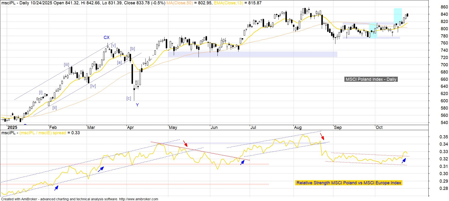 Kluczowy z punktu widzenia inwestorów zagranicznych indeks MSCI Poland przed tygodniem podjął długo odwlekającą się próbę ruchu ponad wynoszące 814 pkt górne ograniczenie konsolidacji, pod znakiem której upłynęło poprzednie półtora miesiąca. Udane wybicie wiąże się z krótkoterminowym potencjałem wzrostowym odpowiadającym szerokości konsolidacji (855 pkt), co w dłuższej perspektywie jeszcze nie zwiększa szans na przekroczenie tegorocznego szczytu 859 pkt z połowy sierpnia. W obszarze siły relatywnej zwraca uwagę ubiegłotygodniowe wyjście górą wskaźnika Relative Strength MSCI Poland vs MSCI Europe Index z opadającego kanału trendowego budowanego od początku września, co zmniejsza niepewność co do pełnej realizacji potencjału wzrostowego związanego z wybiciem.