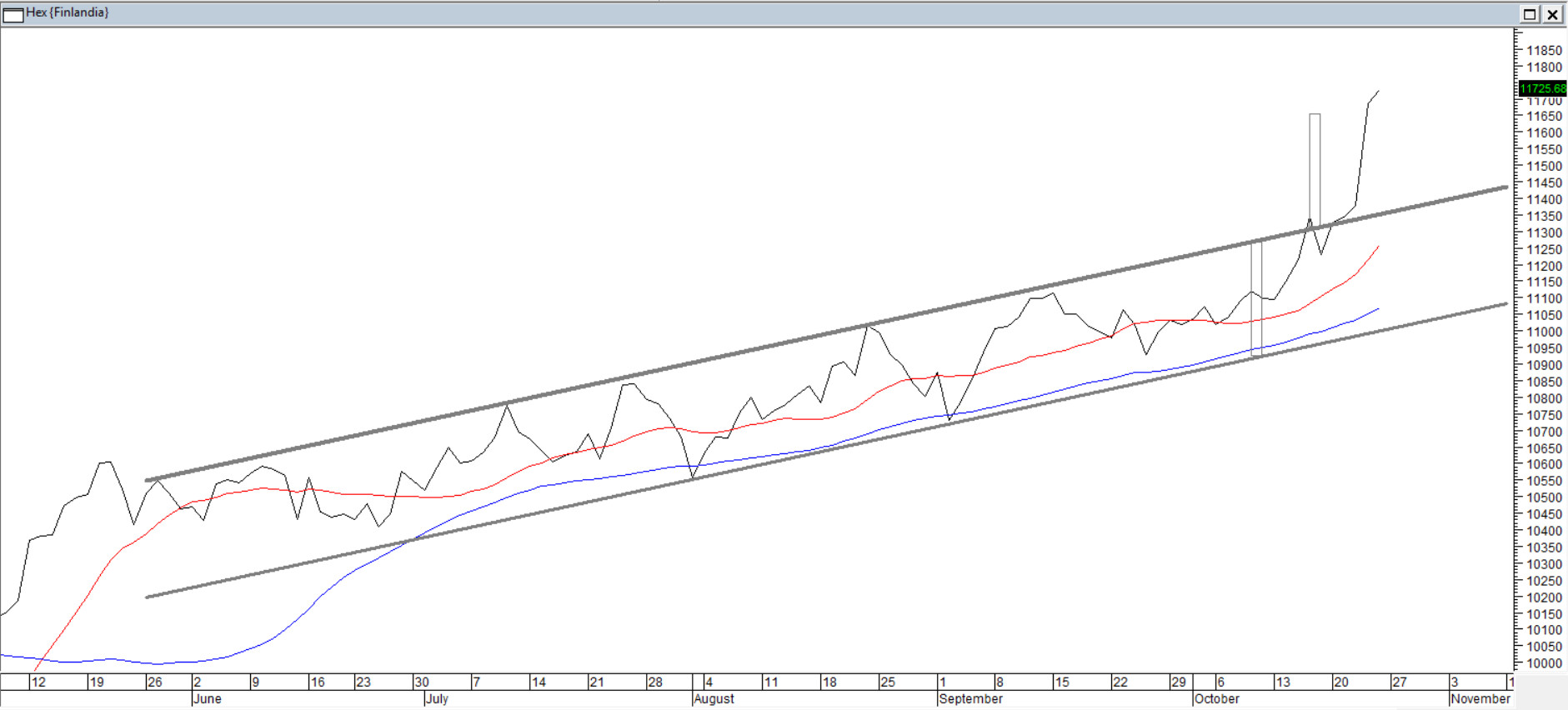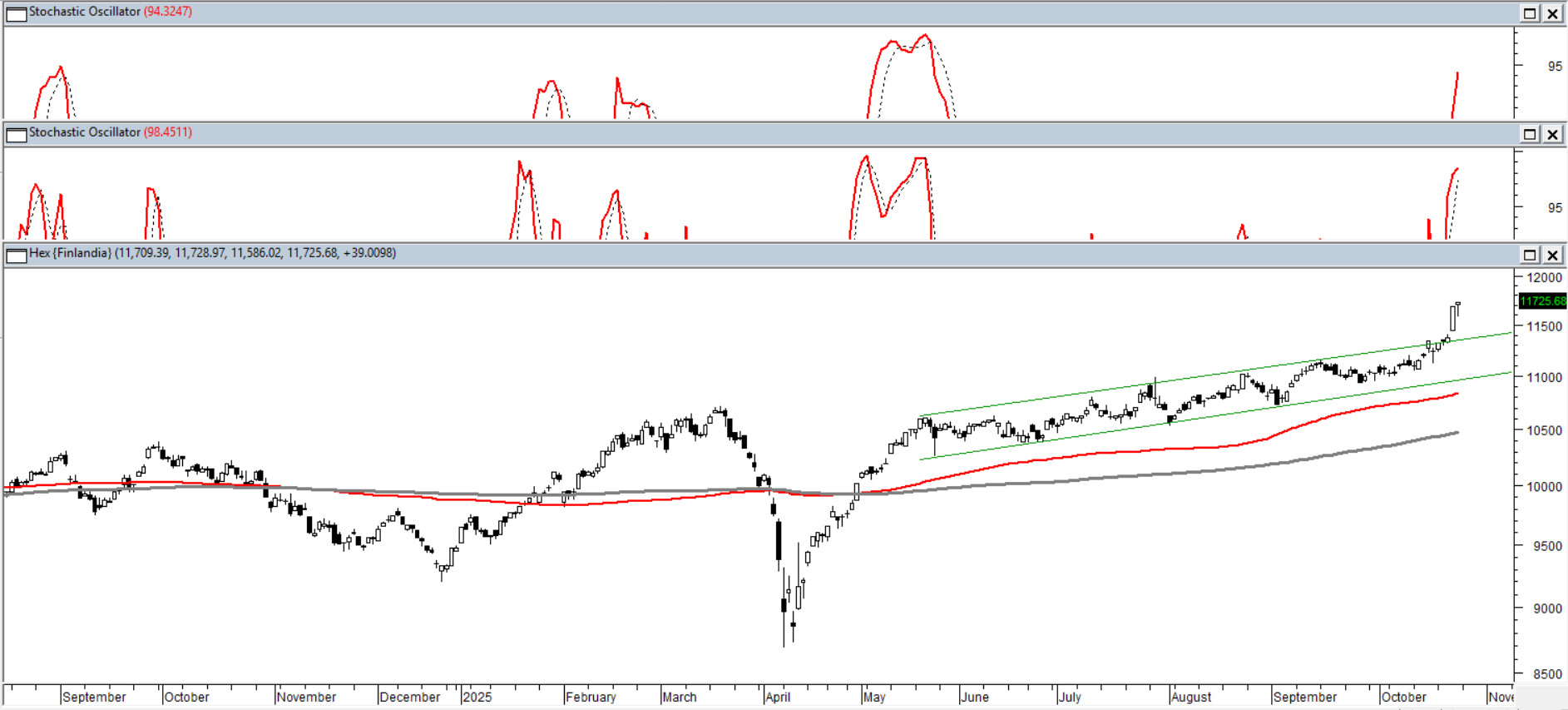 Najpopularniejszy indeks Finlandii, który wcześniej przez kilka miesięcy poruszał się w typowym wielomiesięcznym kanale wzrostowym, zrealizował pełen zasięg wynikający z jego szerokości po październikowym wybiciu, osiągając najwyższy poziom od lutego 2022 roku. Układ średnich 15/45/100/200 jest książkowo wzrostowy — krzywe rozchylają się wachlarzowo, co potwierdza dojrzałą fazę trendu. Jednak zarówno oscylatory szybkie, jak i wolne przebywają już powyżej poziomów uznawanych za groźne dla jego trwania w podobnej wzrostowej formule. Trend trwa, to oczywiste, ale na obecnych poziomach schłodzenie inwestorów i mocniejsze zaangażowanie niedźwiedzi już nie zdziwi.
