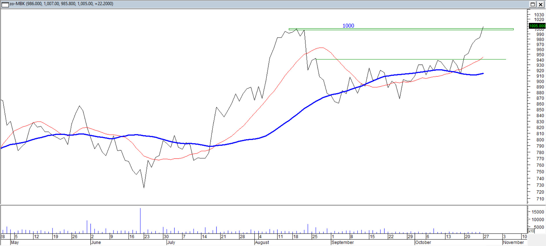 Po dynamicznym wybiciu z wrześniowej konsolidacji kurs mBanku dotarł w rejon psychologicznego poziomu 1000 zł, który przez ostatnie miesiące pozostawał naturalnym celem wzrostowego impulsu.