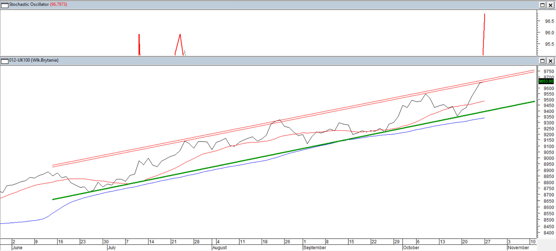 Brytyjski indeks blue chipów od miesięcy porusza się w stabilnym, lekko nachylonym kanale wzrostowym. Kolejne dołki i szczyty układają się podręcznikowo, a rynek z chirurgiczną precyzją respektuje dolne i górne ograniczenia kanału. Średnie 45 i 100 tworzą uporządkowany układ potwierdzający siłę trendu, ale przy jednoczesnym braku dynamiki charakterystycznej dla impulsów spekulacyjnych. Oscylator szybki utrzymuje się powyżej 95 pkt, wskazując na dość mocny stan wykupienia i kolejny zwrot. FTSE100 rośnie – bez ekscytacji, bez emocji, po prostu konsekwentnie w górę. Ryzyko? Ono na giełdzie jest zawsze.