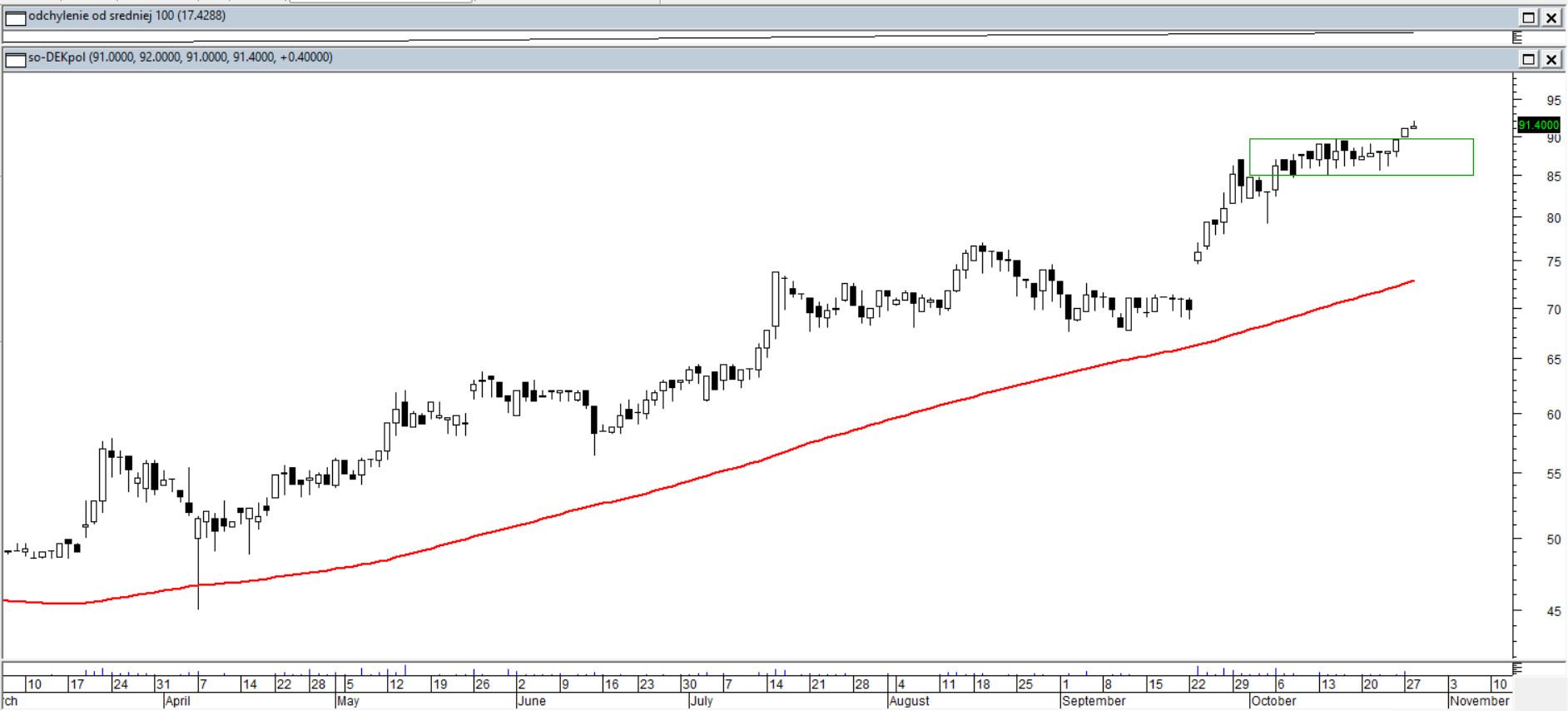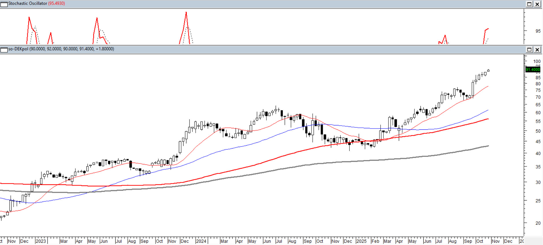 Po wybiciu z kilkutygodniowej konsolidacji kurs Dekpolu osiągnął kolejne historyczne maksima, potwierdzając siłę trendu i stabilność popytu. Strefa 87 zł stanowi obecnie kluczowe wsparcie — to tam przebiega minimum ostatniej konsolidacji. Odchylenie od średniej ze 100 sesji sięga 17%, a walor już od ośmiu miesięcy utrzymuje się powyżej tej średniej. Gdyby przyjąć przeciętne odchylenie z tego okresu jako punkt odniesienia, walor znalazłby się w pierwszej piętnastce najsilniejszych walorów GPW – w gronie spółek, dla których trend wzrostowy jest stanem naturalnym, a nie chwilowym zrywem. Wykupienie oscylatorów tygodniowych zaczyna już trochę niepokoić — poziomy powyżej 90 pkt nie należą jednak w tym układzie do stanów naturalnych. Wprawdzie trend nadal trwa, ale czujność w tym miejscu z pewnością warto wzmóc.