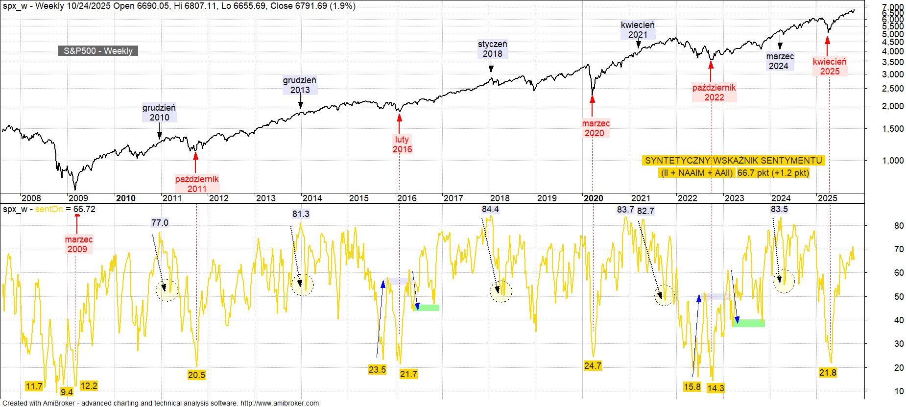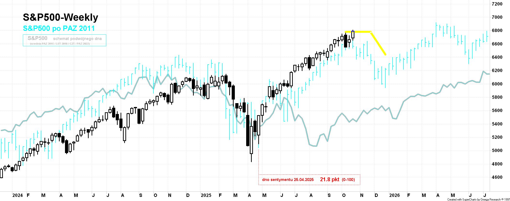 Syntetyczny wskaźnik sentymentu uśredniający znormalizowane do przedziału 0-100 pkt cotygodniowe dane sporządzane przez Investors Intelligence (biuletyny inwestycyjne), NAAIM (aktywni zarządzający) oraz AAII (inwestorzy indywidualni) od początku lipca stabilizuje się po wcześniejszym dwumiesięcznym mocnym odbiciu z jednej z najniższych w ostatnim dziesięcioleciu wartości 21.8 pkt. Co szczególnie warte podkreślenia, ten odnotowany w kwietniu odczyt ulokował się w zakresie 14.3 – 24.7 pkt, gdzie w ostatnich czterech cyklach formowały się kontrariańskie dna sentymentu. Interpretacja skrajnie niskich odczytów sentymentu (w przeciwieństwie do odczytów skrajnie wysokich) jest dość jednoznaczna – pojawiają się one praktycznie jednocześnie z dnami bessy na rynku akcji. Należałoby przy tym dokonać rozróżnienia na schemat ‘pojedynczego dna’ (jak w październiku 2011 i marcu 2020) oraz ‘podwójnego dna’ (październik 2015 / luty 2016 i czerwiec/październik 2022). Zasadniczo jeszcze do końca pierwszego półrocza trudno było ocenić, który z tych wariantów ma większe szanse pojawić się obecnie, jednak dwie wysokie tygodniowe białe świece S&P500 z przełomu czerwca i lipca już bardziej zdecydowanie opowiedziały się za opcją szybkiego odbicia z ‘pojedynczego dna’. Podobnie można interpretować fakt, iż wskaźnik syntetyczny zdołał na dłużej zadomowić się powyżej pułapu 60 pkt, co w przeszłości zawsze sygnalizowało, iż pierwsza kontra podażowa w nowo rodzącej się hossie nie okaże się głęboka, mając jedynie typowo korekcyjny charakter. Schemat ‘pojedynczego dna’ został zobrazowany na wykresie ścieżek zachowania S&P500 po kontrariańskich dnach sentymentu przez ścieżkę zapoczątkowaną w październiku 2011 (pominięcie przypadku z marca 2020 o skrajnie wysokiej zmienności podyktowane jest względami przejrzystości wykresu). Gdyby podobieństwo do tej ścieżki było nadal utrzymane, w IV kwartale br. należałoby oczekiwać okresowego korekcyjnego schłodzenia. Przez jakiś czas przed takim scenariuszem ostrzegała długa czarna świeca z 10 października, jednak po kończącym miniony tydzień wyjściu na nowe roczne maksima, sygnały przejścia do korekty nie mają na chwilę obecną miejsca.