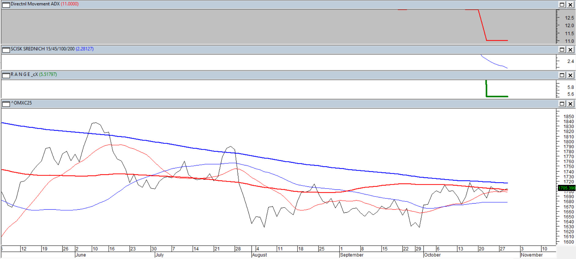 Najbardziej popularny indeks Danii tkwi w wąskiej konsolidacji pomiędzy ściśniętymi średnimi 15/45/100/200, które znalazły się tak blisko siebie pierwszy raz od października ubiegłego roku. ADX(14) porusza się płasko na poziomie 11 pkt, co oznacza gotowość do nowego trendu, a 60-dniowy rozrzut pomiędzy ekstremami cenowymi spadł poniżej 6% — najniżej od 15 miesięcy. Zmienność minimalna, emocje wygaszone. Ale im dłużej trwa taki ścisk, tym gwałtowniejsze bywa przebudzenie. Na razie Kopenhaga śpi spokojnie. Byki wciąż mają szansę — niedźwiedzie zasypiają w listopadzie.