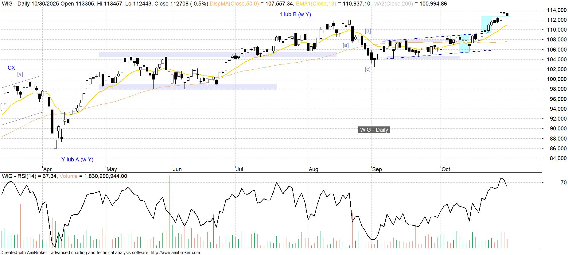 Na pierwszej sesji minionego tygodnia WIG wybił się z 1.5-miesięcznej konsolidacji, która od początku października przybrała formę nieznacznie nachylonego w górę kanału. Krótkoterminowy potencjał wzrostowy odpowiadający szerokości opuszczonego kanału wynosił 112.6 tys. pkt, jednak sięgająca wyżej bycza długa biała świeca z ostatniego wtorku zasygnalizowała możliwość jego zwiększenia. W tej sytuacji o przeważających szansach na przedłużenie zwyżki będzie można mówić do czasu obrony wcześniejszego docelowego pułapu 112.6 tys. od góry, a jego znaczenie jako głównej linii obrony jest obecnie podkreślone wypadającą dokładnie w tym miejscu połową wtorkowej białej świecy. Po wczorajszym cofnięciu margines bezpieczeństwa jest już znikomy, a jednym z czynników ryzyka jest zachowanie rynków z zewnętrznych, gdzie w większości nadal aktualna pozostaje kwestia pierwszej większej korekty w fali hossy trwającej od kwietnia br.