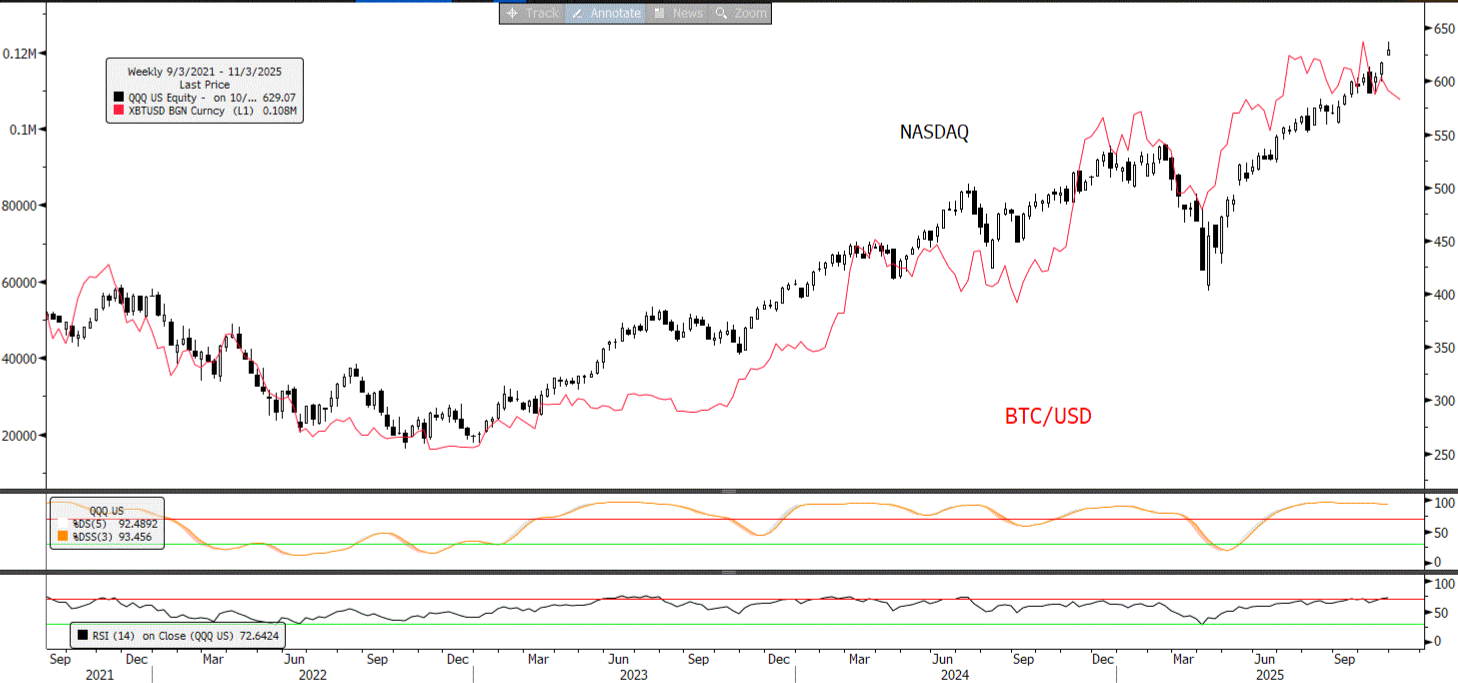 AT tygodniowy NASDAQ: zeszły tydzień rozpoczął się luką hossy, przy czym górny cień sygnalizuje wyczerpywanie się impetu popytu, co w przypadku spadku BTC/USD aktualnie o 2,8%, zwiększa ryzyko negatywnej luki (luki bessy czy luki startowej) i uformowania wyspy odwrotu, która ma negatywną wymowę.
