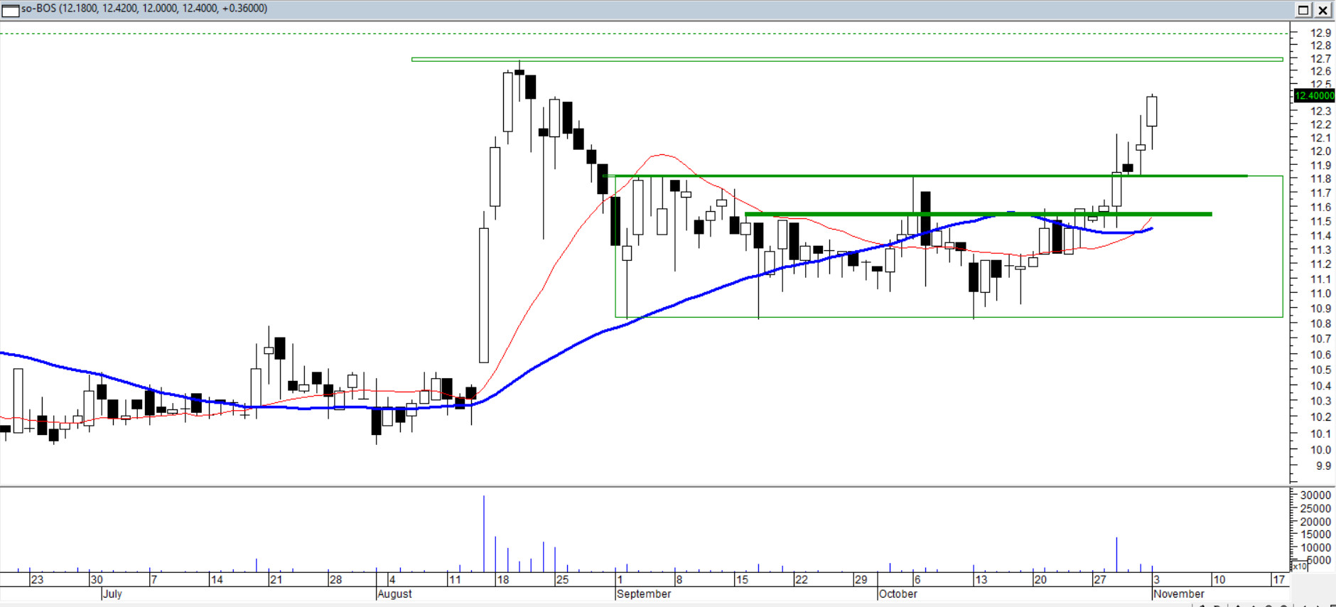 Ruch po ubiegłotygodniowym wybiciu ponad 11,80 przyspiesza. Wybicie zostało potwierdzone świecowo, ale i wolumenowo. Zasięg po wybiciu z konsolidacji, która przyjęła postać prostokąta lub spodka, wskazuje na ruch powyżej sierpniowego szczytu. Średnie 15/45 przecięły się w kierunku wzrostowym — byki mogą dostrzegać w tym zapowiedź dalszego marszu w górę.