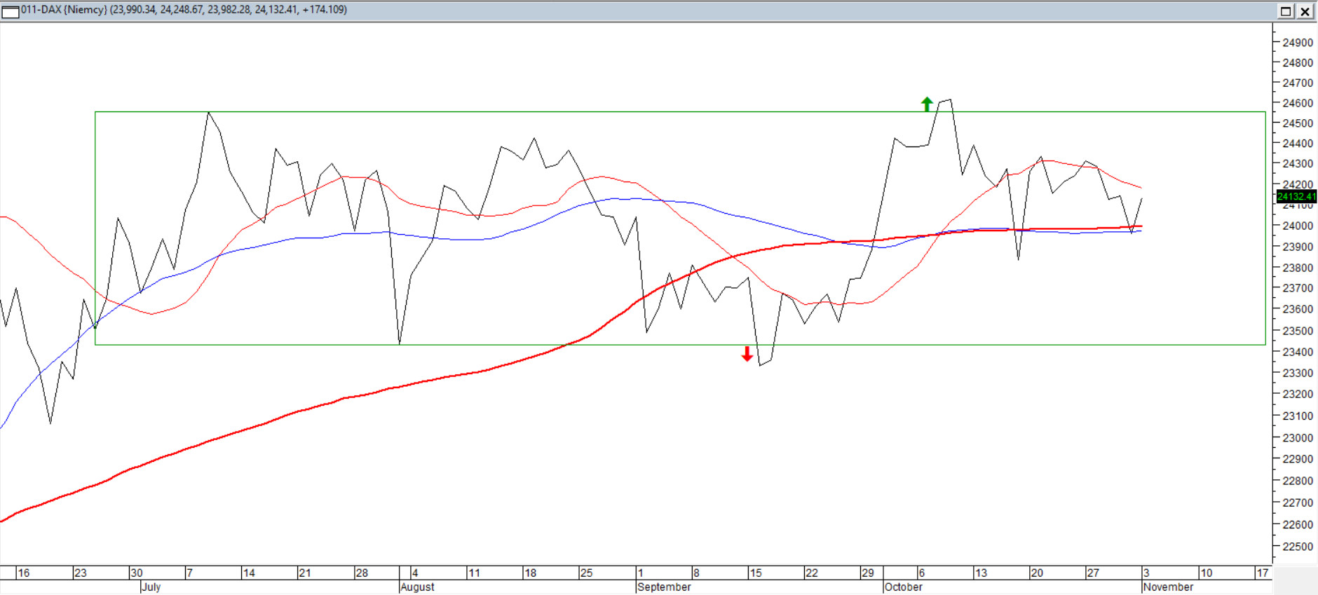 Indeks największych niemieckich spółek nadal tkwi w nudnym prostokącie. Od drugiej połowy maja kurs porusza się w klasycznym dość wąskim ruchu bocznym. W tym czasie pojawiły się dwa „emocjonujące” epizody: – fałszywe wybicie górą w październiku, – i podobny numer dołem we wrześniu. Średnie 15/45/100/200 posplatane – mówią : rynek jest bez kierunku. Strefa 23 500–24 700 dalej trzyma niemieckich inwestorów nieco zdezorientowanych i na dystans. W tej sytuacji pozostaje właściwie tylko jedno słowo: ...