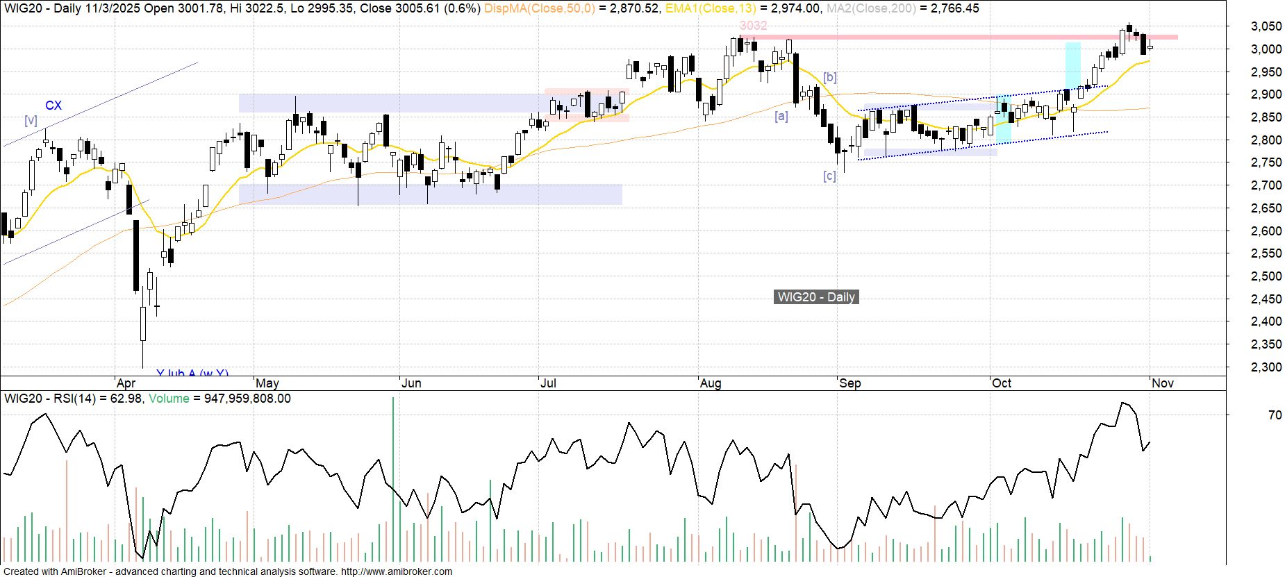 WIG20 przed tygodniem zrealizował wynoszący ok. 3 015 pkt krótkoterminowy potencjał wzrostowy sugerowany przez szerokość opuszczonej ponad 1.5-miesięcznej konsolidacji, która od początku października przybrała formę nieznacznie nachylonego w górę kanału. W tej newralgicznej sytuacji szansą na przedłużenie zwyżek byłoby trwałe wyjście ponad dotychczasowe tegoroczne maksimum 3 032 pkt z 11 sierpnia, co początkowo mogła sugerować długa biała świeca z ubiegłego wtorku. Ten byczy element został jednak zneutralizowany, a bez powrotu ponad wspomniane 3 032 pkt w średnim terminie bliżej do budowy ostrzegawczego układu naruszenia szczytu.
